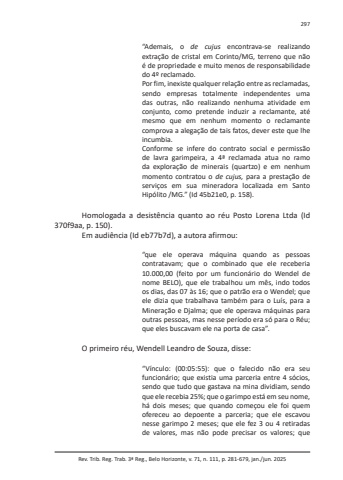 Rev. Trib. Reg. Trab. 3ª Reg., Belo Horizonte, v. 71, n. 111, p. 281-679, jan./jun. 2025297“Ademais, o de cujus encontrava-se realizando extração de cristal em Corinto/MG, terreno que não é de propriedade e muito menos de responsabilidade do 4º reclamado.Por fim, inexiste qualquer relação entre as reclamadas, sendo empresas totalmente independentes uma das outras, não realizando nenhuma atividade em conjunto, como pretende induzir a reclamante, até mesmo que em nenhum momento o reclamante comprova a alegação de tais fatos, dever este que lhe incumbia.Conforme se infere do contrato social e permissão de lavra garimpeira, a 4ª reclamada atua no ramo da exploração de minerais (quartzo) e em nenhum momento contratou o de cujus, para a prestação de serviços em sua mineradora localizada em Santo Hipólito /MG.” (Id 45b21e0, p. 158).Homologada a desistência quanto ao réu Posto Lorena Ltda (Id 370f9aa, p. 150).Em audiência (Id eb77b7d), a autora afirmou:“que ele operava máquina quando as pessoas contratavam; que o combinado que ele receberia 10.000,00 (feito por um funcionário do Wendel de nome BELO), que ele trabalhou um mês, indo todos os dias, das 07 às 16; que o patrão era o Wendel; que ele dizia que trabalhava também para o Luís, para a Mineração e Djalma; que ele operava máquinas para outras pessoas, mas nesse período era só para o Réu; que eles buscavam ele na porta de casa”.O primeiro réu, Wendell Leandro de Souza, disse:“Vínculo: (00:05:55): que o falecido não era seu funcionário; que existia uma parceria entre 4 sócios, sendo que tudo que gastava na mina dividiam, sendo que ele recebia 25%; que o garimpo está em seu nome, há dois meses; que quando começou ele foi quem ofereceu ao depoente a parceria; que ele escavou nesse garimpo 2 meses; que ele fez 3 ou 4 retiradas de valores, mas não pode precisar os valores; que