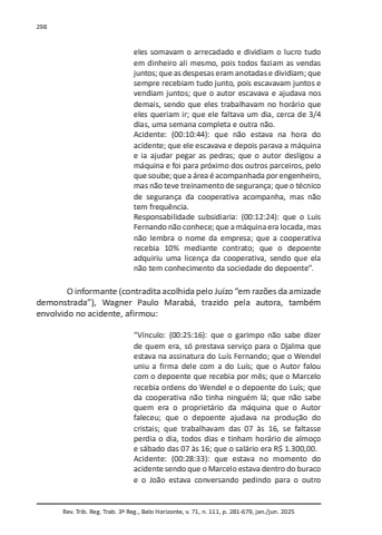 Rev. Trib. Reg. Trab. 3ª Reg., Belo Horizonte, v. 71, n. 111, p. 281-679, jan./jun. 2025298eles somavam o arrecadado e dividiam o lucro tudo em dinheiro ali mesmo, pois todos faziam as vendas juntos; que as despesas eram anotadas e dividiam; que sempre recebiam tudo junto, pois escavavam juntos e vendiam juntos; que o autor escavava e ajudava nos demais, sendo que eles trabalhavam no horário que eles queriam ir; que ele faltava um dia, cerca de 3/4 dias, uma semana completa e outra não.Acidente: (00:10:44): que não estava na hora do acidente; que ele escavava e depois parava a máquina e ia ajudar pegar as pedras; que o autor desligou a máquina e foi para próximo dos outros parceiros, pelo que soube; que a área é acompanhada por engenheiro, mas não teve treinamento de segurança; que o técnico de segurança da cooperativa acompanha, mas não tem frequência.Responsabilidade subsidiaria: (00:12:24): que o Luis Fernando não conhece; que a máquina era locada, mas não lembra o nome da empresa; que a cooperativa recebia 10% mediante contrato; que o depoente adquiriu uma licença da cooperativa, sendo que ela não tem conhecimento da sociedade do depoente”.O informante (contradita acolhida pelo Juízo “em razões da amizade demonstrada”), Wagner Paulo Marabá, trazido pela autora, também envolvido no acidente, afirmou:“Vínculo: (00:25:16): que o garimpo não sabe dizer de quem era, só prestava serviço para o Djalma que estava na assinatura do Luís Fernando; que o Wendel uniu a firma dele com a do Luís; que o Autor falou com o depoente que recebia por mês; que o Marcelo recebia ordens do Wendel e o depoente do Luís; que da cooperativa não tinha ninguém lá; que não sabe quem era o proprietário da máquina que o Autor faleceu; que o depoente ajudava na produção do cristais; que trabalhavam das 07 às 16, se faltasse perdia o dia, todos dias e tinham horário de almoço e sábado das 07 às 16; que o salário era R$ 1.300,00.Acidente: (00:28:33): que estava no momento do acidente sendo que o Marcelo estava dentro do buraco e o João estava conversando pedindo para o outro