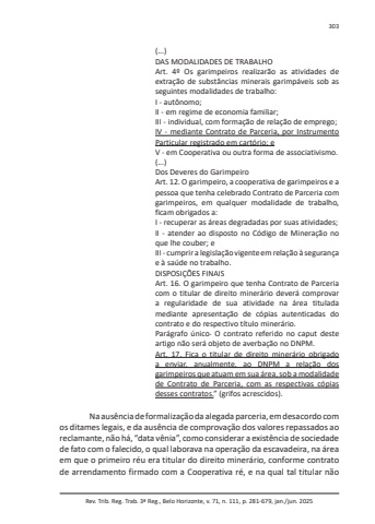 Rev. Trib. Reg. Trab. 3ª Reg., Belo Horizonte, v. 71, n. 111, p. 281-679, jan./jun. 2025303(...)DAS MODALIDADES DE TRABALHOArt. 4º Os garimpeiros realizarão as atividades de extração de substâncias minerais garimpáveis sob as seguintes modalidades de trabalho:I - autônomo;II - em regime de economia familiar;III - individual, com formação de relação de emprego;IV - mediante Contrato de Parceria, por Instrumento Particular registrado em cartório; eV - em Cooperativa ou outra forma de associativismo.(...)Dos Deveres do GarimpeiroArt. 12. O garimpeiro, a cooperativa de garimpeiros e a pessoa que tenha celebrado Contrato de Parceria com garimpeiros, em qualquer modalidade de trabalho, ficam obrigados a:I - recuperar as áreas degradadas por suas atividades;II - atender ao disposto no Código de Mineração no que lhe couber; eIII - cumprir a legislação vigente em relação à segurança e à saúde no trabalho.DISPOSIÇÕES FINAISArt. 16. O garimpeiro que tenha Contrato de Parceria com o titular de direito minerário deverá comprovar a regularidade de sua atividade na área titulada mediante apresentação de cópias autenticadas do contrato e do respectivo título minerário.Parágrafo único. O contrato referido no caput deste artigo não será objeto de averbação no DNPM.Art. 17. Fica o titular de direito minerário obrigado a enviar, anualmente, ao DNPM a relação dos garimpeiros que atuam em sua área, sob a modalidade de Contrato de Parceria, com as respectivas cópias desses contratos.” (grifos acrescidos).Na ausência de formalização da alegada parceria, em desacordo com os ditames legais, e da ausência de comprovação dos valores repassados ao reclamante, não há, “data vênia”, como considerar a existência de sociedade de fato com o falecido, o qual laborava na operação da escavadeira, na área em que o primeiro réu era titular do direito minerário, conforme contrato de arrendamento firmado com a Cooperativa ré, e na qual tal titular não