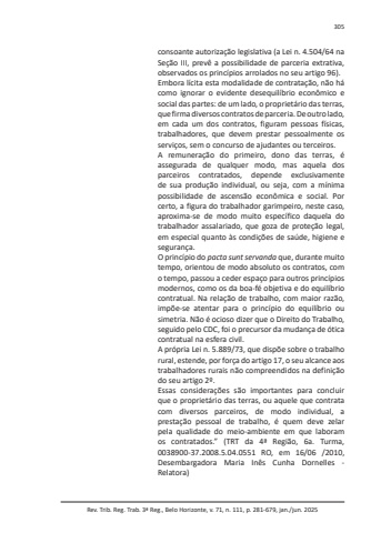 Rev. Trib. Reg. Trab. 3ª Reg., Belo Horizonte, v. 71, n. 111, p. 281-679, jan./jun. 2025305consoante autorização legislativa (a Lei n. 4.504/64 na Seção III, prevê a possibilidade de parceria extrativa, observados os princípios arrolados no seu artigo 96).Embora lícita esta modalidade de contratação, não há como ignorar o evidente desequilíbrio econômico e social das partes: de um lado, o proprietário das terras, que firma diversos contratos de parceria. De outro lado, em cada um dos contratos, figuram pessoas físicas, trabalhadores, que devem prestar pessoalmente os serviços, sem o concurso de ajudantes ou terceiros.A remuneração do primeiro, dono das terras, é assegurada de qualquer modo, mas aquela dos parceiros contratados, depende exclusivamente de sua produção individual, ou seja, com a mínima possibilidade de ascensão econômica e social. Por certo, a figura do trabalhador garimpeiro, neste caso, aproxima-se de modo muito específico daquela do trabalhador assalariado, que goza de proteção legal, em especial quanto às condições de saúde, higiene e segurança.O princípio do pacta sunt servanda que, durante muito tempo, orientou de modo absoluto os contratos, com o tempo, passou a ceder espaço para outros princípios modernos, como os da boa-fé objetiva e do equilíbrio contratual. Na relação de trabalho, com maior razão, impõe-se atentar para o princípio do equilíbrio ou simetria. Não é ocioso dizer que o Direito do Trabalho, seguido pelo CDC, foi o precursor da mudança de ótica contratual na esfera civil.A própria Lei n. 5.889/73, que dispõe sobre o trabalho rural, estende, por força do artigo 17, o seu alcance aos trabalhadores rurais não compreendidos na definição do seu artigo 2º.Essas considerações são importantes para concluir que o proprietário das terras, ou aquele que contrata com diversos parceiros, de modo individual, a prestação pessoal de trabalho, é quem deve zelar pela qualidade do meio-ambiente em que laboram os contratados.” (TRT da 4ª Região, 6a. Turma, 0038900-37.2008.5.04.0551 RO, em 16/06 /2010, Desembargadora Maria Inês Cunha Dornelles - Relatora)