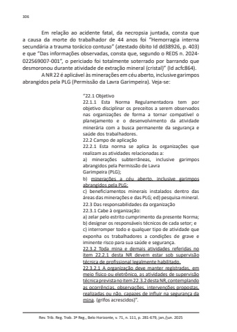 Rev. Trib. Reg. Trab. 3ª Reg., Belo Horizonte, v. 71, n. 111, p. 281-679, jan./jun. 2025306Em relação ao acidente fatal, da necropsia juntada, consta que a causa da morte do trabalhador de 44 anos foi “Hemorragia interna secundária a trauma torácico contuso” (atestado óbito Id dd38926, p. 403) e que “Das informações observadas, consta que, segundo o REDS n. 2024-022569007-001”, o periciado foi totalmente soterrado por barrando que desmoronou durante atividade de extração mineral (cristal)” (Id acfc864).A NR 22 é aplicável às minerações em céu aberto, inclusive garimpos abrangidos pela PLG (Permissão da Lavra Garimpeira). Veja-se:“22.1 Objetivo22.1.1 Esta Norma Regulamentadora tem por objetivo disciplinar os preceitos a serem observados nas organizações de forma a tornar compatível o planejamento e o desenvolvimento da atividade minerária com a busca permanente da segurança e saúde dos trabalhadores.22.2 Campo de aplicação22.2.1 Esta norma se aplica às organizações que realizam as atividades relacionadas a:a) minerações subterrâneas, inclusive garimpos abrangidos pela Permissão de LavraGarimpeira (PLG);b) minerações a céu aberto, inclusive garimpos abrangidos pela PLG;c) beneficiamentos minerais instalados dentro das áreas das minerações e das PLG; ed) pesquisa mineral.22.3 Das responsabilidades da organização22.3.1 Cabe à organização:a) zelar pelo estrito cumprimento da presente Norma;b) designar os responsáveis técnicos de cada setor; ec) interromper todo e qualquer tipo de atividade que exponha os trabalhadores a condições de grave e iminente risco para sua saúde e segurança.22.3.2 Toda mina e demais atividades referidas no item 22.2.1 desta NR devem estar sob supervisão técnica de profissional legalmente habilitado.22.3.2.1 A organização deve manter registradas, em meio físico ou eletrônico, as atividades de supervisão técnica prevista no item 22.3.2 desta NR, contemplando as ocorrências, observações, intervenções propostas, realizadas ou não, capazes de influir na segurança da mina. (grifos acrescidos)”.