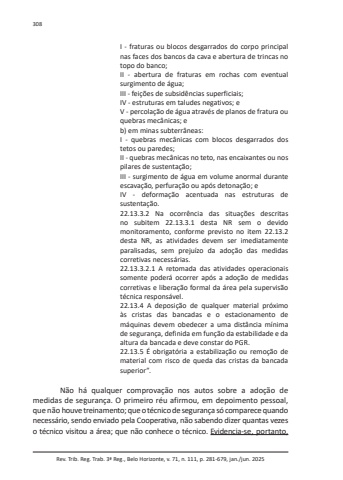 Rev. Trib. Reg. Trab. 3ª Reg., Belo Horizonte, v. 71, n. 111, p. 281-679, jan./jun. 2025308I - fraturas ou blocos desgarrados do corpo principal nas faces dos bancos da cava e abertura de trincas no topo do banco;II - abertura de fraturas em rochas com eventual surgimento de água;III - feições de subsidências superficiais;IV - estruturas em taludes negativos; eV - percolação de água através de planos de fratura ou quebras mecânicas; eb) em minas subterrâneas:I - quebras mecânicas com blocos desgarrados dos tetos ou paredes;II - quebras mecânicas no teto, nas encaixantes ou nos pilares de sustentação;III - surgimento de água em volume anormal durante escavação, perfuração ou após detonação; eIV - deformação acentuada nas estruturas de sustentação.22.13.3.2 Na ocorrência das situações descritas no subitem 22.13.3.1 desta NR sem o devido monitoramento, conforme previsto no item 22.13.2 desta NR, as atividades devem ser imediatamente paralisadas, sem prejuízo da adoção das medidas corretivas necessárias.22.13.3.2.1 A retomada das atividades operacionais somente poderá ocorrer após a adoção de medidas corretivas e liberação formal da área pela supervisão técnica responsável.22.13.4 A deposição de qualquer material próximo às cristas das bancadas e o estacionamento de máquinas devem obedecer a uma distância mínima de segurança, definida em função da estabilidade e da altura da bancada e deve constar do PGR.22.13.5 É obrigatória a estabilização ou remoção de material com risco de queda das cristas da bancada superior”.Não há qualquer comprovação nos autos sobre a adoção de medidas de segurança. O primeiro réu afirmou, em depoimento pessoal, que não houve treinamento; que o técnico de segurança só comparece quando necessário, sendo enviado pela Cooperativa, não sabendo dizer quantas vezes o técnico visitou a área; que não conhece o técnico. Evidencia-se, portanto,