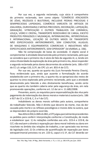 Rev. Trib. Reg. Trab. 3ª Reg., Belo Horizonte, v. 71, n. 111, p. 281-679, jan./jun. 2025310Por sua vez, a segunda reclamada, cuja sócia é companheira do primeiro reclamado, tem como objeto “COMÉRCIO ATACADISTA DE JÓIAS, RELÓGIOS E BIJUTERIAS, INCLUSIVE PEDRAS PRECIOSAS E SEMIPRECIOSAS LAPIDADAS, COMÉRCIO VAREJISTA DE ARTIGOS DE JOALHERIA, OURIVESARIA E METAIS PRECIOSOS, DECORAÇÃO, LAPIDAÇÃO, GRAVAÇÃO, VITRIFICAÇÃO E OUTROS TRABALHOS EM CERÂMICA, LOUÇA, VIDRO E CRISTAL, TRANSPORTE RODOVIÁRIO DE CARGA, EXCETO PRODUTOS PERIGOSOS E MUDANÇAS, INTERMUNICIPAL, INTERESTADUAL E INTERNACIONAL, LOCAÇÃO DE OUTROS MEIOS DE TRANSPORTE NÃO ESPECIFICADOS ANTERIORMENTE, SEM CONDUTOR, ALUGUEL DE MAQUINAS E EQUIPAMENTOS COMERCIAIS E INDUSTRIAIS NÃO ESPECIFICADOS ANTERIORMENTE, SEM OPERADOR” (Id efa90e4, p. 336).Não há comprovação de baixa da sociedade. O objeto social é complementar à atividade desenvolvida pelo primeiro reclamado, pelo que se considera que o primeiro réu é sócio de fato da segunda ré, e, tendo em vista a titularidade da exploração da área pelo primeiro réu, deve responder a segunda reclamada pelos danos decorrentes do acidente (arts. 186 e 927 do CC c/c artigo 133, § 2º, do CPC c/c art. 855-A da CLT).Por sua vez, quanto ao quarto réu (Luis Fernando Pereira Chavis), ficou evidenciado que, ainda que ausente a formalização do acordo estabelecido com o primeiro réu, o quarto réu se apropriava dos restos de quartzo na área explorada pelo primeiro reclamado, pelo que a atividade desenvolvida pelo falecido a eles diretamente beneficiava, sendo certo que ao quarto réu também caberia zelar pela segurança da área, em nela promovendo operações, conforme art. 12 da Lei n. 11.685/2008.Presentes, assim, os requisitos para responsabilização dos réus pelo pagamento de indenização dos danos morais e materiais à autora (arts. 186 e 927 do CC e 223-B, C, E e F da CLT).Indubitáveis os danos morais sofridos pela autora, companheira do trabalhador falecido. Não é direito que decorre da morte, mas da dor causada pela morte e os reflexos psicológicos e morais dela na autora, que se depreendem do próprio ocorrido.Nas ADIs 6.050, 6.069 e 6.082, o STF julgou parcialmente procedentes os pedidos para conferir interpretação conforme a Constituição, de modo a estabelecer que: 1) As redações conferidas aos arts. 223-A e 223-B, da CLT, não excluem o direito à reparação por dano moral indireto ou dano em ricochete no âmbito das relações de trabalho, a ser apreciado nos termos da legislação civil; 2) Os critérios de quantificação de reparação por dano extrapatrimonial previstos no art. 223-G, caput e § 1º, da CLT deverão ser