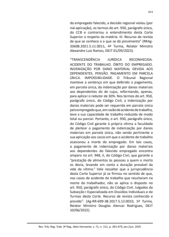 Rev. Trib. Reg. Trab. 3ª Reg., Belo Horizonte, v. 71, n. 111, p. 281-679, jan./jun. 2025313do empregado falecido, a decisão regional violou (por má-aplicação), os termos do art. 950, parágrafo único, do CCB e contrariou o entendimento desta Corte Superior a respeito da matéria. III. Recurso de revista de que se conhece e a que se dá provimento” (RRAg33608.2021.5.11.0011, 4ª Turma, Relator Ministro Alexandre Luiz Ramos, DEJT 01/09/2023).“TRANSCENDÊNCIA JURÍDICA RECONHECIDA. ACIDENTE DO TRABALHO. ÓBITO DO EMPREGADO. INDENIZAÇÃO POR DANO MATERIAL DEVIDA AOS DEPENDENTES. PENSÃO. PAGAMENTO EM PARCELA ÚNICA. IMPOSSIBILIDADE. O Tribunal Regional manteve a sentença em que deferido o pagamento, em parcela única, da indenização por danos materiais aos dependentes do de cujus, reformando, apenas, para aplicar o redutor de 30%. Nos termos do art. 950, parágrafo único, do Código Civil, a indenização por danos materiais pode ser requerida em parcela única pelo empregado que, em razão de acidente de trabalho, teve a sua capacidade de trabalho reduzida de modo total ou parcial. Portanto, o art. 950, parágrafo único, do Código Civil garante à própria vítima a faculdade de pleitear o pagamento de indenização por danos materiais em parcela única, não sendo pertinente a sua aplicação aos casos em que o acidente de trabalho ocasionou a morte do empregado. Em tais casos, o pagamento de indenização por danos materiais aos dependentes do falecido empregado encontra amparo no art. 948, II, do Código Civil, que garante a “prestação de alimentos às pessoas a quem o morto os devia, levando em conta a duração provável da vida da vítima.” Vale ressaltar que a jurisprudência desta Corte Superior já se firmou no sentido de que, nos casos de acidente de trabalho que resultaram na morte do trabalhador, não se aplica o disposto no art. 950, parágrafo único, do Código Civil. Julgados da Subseção I Especializada em Dissídios Individuais e de Turmas desta Corte. Recurso de revista conhecido e provido”. (Ag-RR-699-38.2017.5.12.0033, 5ª Turma, Relator Ministro Douglas Alencar Rodrigues, DEJT 10/06/2022).