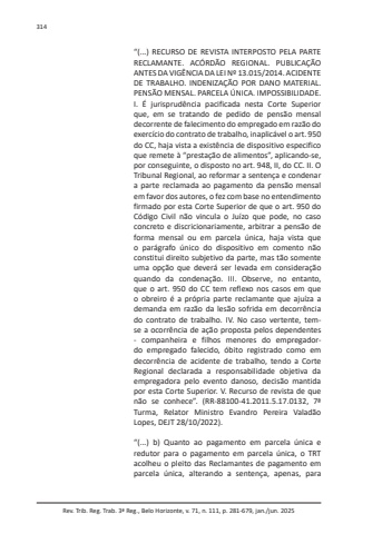 Rev. Trib. Reg. Trab. 3ª Reg., Belo Horizonte, v. 71, n. 111, p. 281-679, jan./jun. 2025314“(...) RECURSO DE REVISTA INTERPOSTO PELA PARTE RECLAMANTE. ACÓRDÃO REGIONAL. PUBLICAÇÃO ANTES DA VIGÊNCIA DA LEI Nº 13.015/2014. ACIDENTE DE TRABALHO. INDENIZAÇÃO POR DANO MATERIAL. PENSÃO MENSAL. PARCELA ÚNICA. IMPOSSIBILIDADE. I. É jurisprudência pacificada nesta Corte Superior que, em se tratando de pedido de pensão mensal decorrente de falecimento do empregado em razão do exercício do contrato de trabalho, inaplicável o art. 950 do CC, haja vista a existência de dispositivo especifico que remete à “prestação de alimentos”, aplicando-se, por conseguinte, o disposto no art. 948, II, do CC. II. O Tribunal Regional, ao reformar a sentença e condenar a parte reclamada ao pagamento da pensão mensal em favor dos autores, o fez com base no entendimento firmado por esta Corte Superior de que o art. 950 do Código Civil não vincula o Juízo que pode, no caso concreto e discricionariamente, arbitrar a pensão de forma mensal ou em parcela única, haja vista que o parágrafo único do dispositivo em comento não constitui direito subjetivo da parte, mas tão somente uma opção que deverá ser levada em consideração quando da condenação. III. Observe, no entanto, que o art. 950 do CC tem reflexo nos casos em que o obreiro é a própria parte reclamante que ajuíza a demanda em razão da lesão sofrida em decorrência do contrato de trabalho. IV. No caso vertente, temse a ocorrência de ação proposta pelos dependentes - companheira e filhos menores do empregadordo empregado falecido, óbito registrado como em decorrência de acidente de trabalho, tendo a Corte Regional declarada a responsabilidade objetiva da empregadora pelo evento danoso, decisão mantida por esta Corte Superior. V. Recurso de revista de que não se conhece”. (RR-88100-41.2011.5.17.0132, 7ª Turma, Relator Ministro Evandro Pereira Valadão Lopes, DEJT 28/10/2022).“(...) b) Quanto ao pagamento em parcela única e redutor para o pagamento em parcela única, o TRT acolheu o pleito das Reclamantes de pagamento em parcela única, alterando a sentença, apenas, para