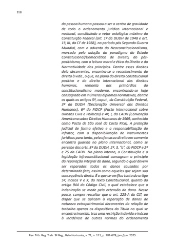 Rev. Trib. Reg. Trab. 3ª Reg., Belo Horizonte, v. 71, n. 111, p. 281-679, jan./jun. 2025318da pessoa humana passou a ser o centro de gravidade de todo o ordenamento jurídico internacional e nacional, constituindo o vetor axiológico máximo da Constituição Federal (art. 1º da DUDH de 1948 e art. 1º, III, da CF de 1988), no período pós Segunda Guerra Mundial, com o advento do Neoconstitucionalismo, marcado pela adoção do paradigma do Estado Constitucional/Democrático de Direito, do póspositivismo, com a leitura moral e ética do Direito e da Normatividade dos princípios. Dentre esses direitos dela decorrentes, encontra-se o reconhecimento do direito à vida , o que, no plano do direito constitucional positivo e do direito internacional dos direitos humanos, remonta aos primórdios do constitucionalismo moderno, encontrando-se hoje consagrado em inúmeros diplomas normativos, dentre os quais os artigos 5º, caput , da Constituição Federal, 3º da DUDH (Declaração Universal dos Direitos Humanos), 6º do PIDCP (Pacto Internacional sobre Direitos Civis e Políticos) e 4º, I, da CADH (Convenção Americana sobre Direitos Humanos de 1969, conhecida como Pacto de São José da Costa Rica). A proteção judicial de forma efetiva e a responsabilização do infrator, com a disponibilização de instrumentos jurídicos para tanto, pela ofensa ao direito em comento encontra guarida no plano internacional, como se percebe dos arts. 8º da DUDH, 2º, 3, “a”, do PIDCP e 2º e 25 da CADH. No plano interno, a Constituição e a legislação infraconstitucional consagram o princípio da reparação integral do dano, segundo o qual devem ser reparados todos os danos causados por determinado fato, assim como aqueles que sejam sua consequência direta. É o que se verifica tanto do artigo 5º, incisos V e X, do Texto Constitucional, quanto do artigo 944 do Código Civil, o qual estabelece que a indenização se mede pela extensão do dano. Nesse passo, cumpre ressaltar que o art. 223-A da CLT, ao dispor que se aplicam à reparação de danos de natureza extrapatrimonial decorrentes da relação de trabalho apenas os dispositivos do Título no qual se encontra inserido, traz uma restrição indevida e inócua à incidência de outras normas do ordenamento