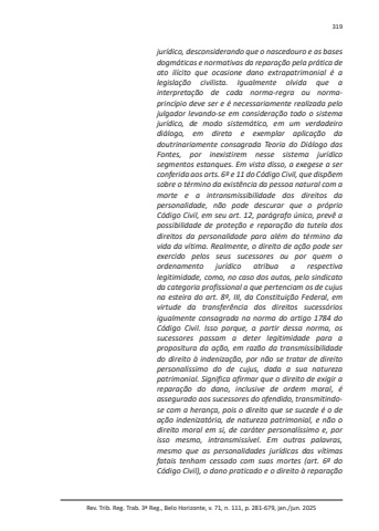 Rev. Trib. Reg. Trab. 3ª Reg., Belo Horizonte, v. 71, n. 111, p. 281-679, jan./jun. 2025319jurídico, desconsiderando que o nascedouro e as bases dogmáticas e normativas da reparação pela prática de ato ilícito que ocasione dano extrapatrimonial é a legislação civilista. Igualmente olvida que a interpretação de cada norma-regra ou normaprincípio deve ser e é necessariamente realizada pelo julgador levando-se em consideração todo o sistema jurídico, de modo sistemático, em um verdadeiro diálogo, em direta e exemplar aplicação da doutrinariamente consagrada Teoria do Diálogo das Fontes, por inexistirem nesse sistema jurídico segmentos estanques. Em vista disso, a exegese a ser conferida aos arts. 6º e 11 do Código Civil, que dispõem sobre o término da existência da pessoa natural com a morte e a intransmissibilidade dos direitos da personalidade, não pode descurar que o próprio Código Civil, em seu art. 12, parágrafo único, prevê a possibilidade de proteção e reparação da tutela dos direitos da personalidade para além do término da vida da vítima. Realmente, o direito de ação pode ser exercido pelos seus sucessores ou por quem o ordenamento jurídico atribua a respectiva legitimidade, como, no caso dos autos, pelo sindicato da categoria profissional a que pertenciam os de cujus na esteira do art. 8º, III, da Constituição Federal, em virtude da transferência dos direitos sucessórios igualmente consagrada na norma do artigo 1784 do Código Civil. Isso porque, a partir dessa norma, os sucessores passam a deter legitimidade para a propositura da ação, em razão da transmissibilidade do direito à indenização, por não se tratar de direito personalíssimo do de cujus, dada a sua natureza patrimonial. Significa afirmar que o direito de exigir a reparação do dano, inclusive de ordem moral, é assegurado aos sucessores do ofendido, transmitindose com a herança, pois o direito que se sucede é o de ação indenizatória, de natureza patrimonial, e não o direito moral em si, de caráter personalíssimo e, por isso mesmo, intransmissível. Em outras palavras, mesmo que as personalidades jurídicas das vítimas fatais tenham cessado com suas mortes (art. 6º do Código Civil), o dano praticado e o direito à reparação