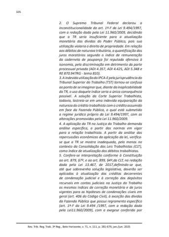 Rev. Trib. Reg. Trab. 3ª Reg., Belo Horizonte, v. 71, n. 111, p. 281-679, jan./jun. 20253262. O Supremo Tribunal Federal declarou a inconstitucionalidade do art. 1º-F da Lei 9.494/1997, com a redação dada pela Lei 11.960/2009, decidindo que a TR seria insuficiente para a atualização monetária das dívidas do Poder Público, pois sua utilização violaria o direito de propriedade. Em relação aos débitos de natureza tributária, a quantificação dos juros moratórios segundo o índice de remuneração da caderneta de poupança foi reputada ofensiva à isonomia, pela discriminação em detrimento da parte processual privada (ADI 4.357, ADI 4.425, ADI 5.348 e RE 870.947RG - tema 810).3. A indevida utilização do IPCA-E pela jurisprudência do Tribunal Superior do Trabalho (TST) tornou-se confusa ao ponto de se imaginar que, diante da inaplicabilidade da TR, o uso daquele índice seria a única consequência possível. A solução da Corte Superior Trabalhista, todavia, lastreia-se em uma indevida equiparação da natureza do crédito trabalhista com o crédito assumido em face da Fazenda Pública, o qual está submetido a regime jurídico próprio da Lei 9.494/1997, com as alterações promovidas pela Lei 11.960/2009.4. A aplicação da TR na Justiça do Trabalho demanda análise específica, a partir das normas em vigor para a relação trabalhista. A partir da análise das repercussões econômicas da aplicação da lei, verificase que a TR se mostra inadequada, pelo menos no contexto da Consolidação das Leis Trabalhistas (CLT), como índice de atualização dos débitos trabalhistas.5. Confere-se interpretação conforme à Constituição ao art. 879, §7º, e ao art. 899, §4º,da CLT, na redação dada pela Lei 13.467, de 2017,definindo-se que, até que sobrevenha solução legislativa, deverão ser aplicados à atualização dos créditos decorrentes de condenação judicial e à correção dos depósitos recursais em contas judiciais na Justiça do Trabalho os mesmos índices de correção monetária e de juros vigentes para as hipóteses de condenações cíveis em geral (art. 406 do Código Civil), à exceção das dívidas da Fazenda Pública que possui regramento específico (art. 1º-F da Lei 9.494 /1997, com a redação dada pela Lei11.960/2009), com a exegese conferida por