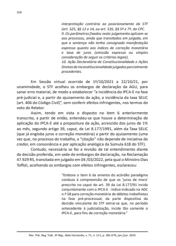 Rev. Trib. Reg. Trab. 3ª Reg., Belo Horizonte, v. 71, n. 111, p. 281-679, jan./jun. 2025328interpretação contrária ao posicionamento do STF (art. 525, §§ 12 e 14, ou art. 535, §§ 5º e 7º, do CPC.9. Os parâmetros fixados neste julgamento aplicam-se aos processos, ainda que transitados em julgado, em que a sentença não tenha consignado manifestação expressa quanto aos índices de correção monetária e taxa de juros (omissão expressa ou simples consideração de seguir os critérios legais).10. Ação Declaratória de Constitucionalidade e Ações Diretas de Inconstitucionalidade julgadas parcialmente procedentes.Em Sessão virtual ocorrida de 1º/10/2021 a 22/10/21, por unanimidade, o STF acolheu os embargos de declaração da AGU, para sanar erro material, de modo a estabelecer “a incidência do IPCA-E na fase pré-judicial e, a partir do ajuizamento da ação, a incidência da taxa SELIC (art. 406 do Código Civil)”, sem conferir efeitos infringentes, nos termos do voto do Relator.Assim, tendo em vista o disposto no item 6 anteriormente transcrito, a partir de então, entendeu-se que houve a determinação de aplicação do IPCA-E até a propositura da ação, acrescido dos juros de 1% ao mês, segundo artigo 39, caput, da Lei 8.177/1991, além da Taxa SELIC (que já engloba juros e correção monetária) a partir do ajuizamento (uma vez que, no processo do trabalho, a “citação” não depende de iniciativa do credor, em consonância e por aplicação analógica da Súmula 618 do STF).Contudo, necessária se fez a revisão de tal entendimento diante da decisão proferida, em sede de embargos de declaração, na Reclamação 47.929 RS, transitada em julgado em 04 /03/2022, pela qual o Ministro Dias Toffoli, acolhendo os embargos com efeitos infringentes, esclareceu:“Embora o item 6 da ementa do acórdão paradigma conduza à compreensão de que os ‘juros de mora’ prescrito no caput do art. 39 da Lei 8.177/91 incida conjuntamente com o IPCA-E - índice indicado na ADC n.º 58 para correção monetária de débitos trabalhistas na fase pré-processual, da parte dispositiva da decisão vinculante do STF extrai-se que, no período antecedente à judicialização, incide tão somente o IPCA-E, para fins de correção monetária.”
