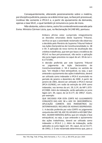 Rev. Trib. Reg. Trab. 3ª Reg., Belo Horizonte, v. 71, n. 111, p. 281-679, jan./jun. 2025329Consequentemente, alterando posicionamento sobre a matéria, por disciplina judiciária, passou-se a determinar que, na fase pré-processual, incidisse tão somente o IPCA-E e, a partir do ajuizamento da demanda, apenas a taxa SELIC, a qual também já remunera os juros de mora.Não obstante, sobre o tema, outro foi o entendimento exarado pela Exma. Ministra Cármen Lúcia, que, na Reclamação 54.248 MG, pontuou:Embora afirme estar cumprindo integralmente as decisões emanadas deste Supremo Tribunal, verifica-se que a autoridade reclamada não observou o decidido pelo Plenário do Supremo Tribunal Federal nas Ações Declaratórias de Constitucionalidade ns. 58 e 59. A aplicação da nova norma de atualização dos créditos trabalhistas, que tem por base a incidência do IPCA-E na fase pré-processual, não exclui a aplicação dos juros legais previstos no caput do art. 39 da Lei n. 8.177/1991.A decisão proferida por este Supremo Tribunal no julgamento da Ação Declaratória de Constitucionalidade n. 58 é taxativa no sentido de que, “em relação à fase extrajudicial, ou seja, a que antecede o ajuizamento das ações trabalhistas, deverá ser utilizado como indexador o IPCA-E acumulado no período de janeiro a dezembro de 2000. A partir de janeiro de 2001, deverá ser utilizado o IPCA-E mensal (IPCA-15/IBGE), em razão da extinção da UFIR como indexador, nos termos do art. 29, § 3º, da MP 1.973-67/2000. Além da indexação, serão aplicados os juros legais (art. 39, caput, da Lei 8.177, de 1991)”. Assim, por exemplo:QUE DECIDIDO POR ESTA CORTE NO JULGAMENTO CONJUNTO DAS ADC 58 e ADC 59. INOCORRÊNCIA. APLICAÇÃO CORRETA DOS PARÂMETROS ALI DETERMINADOS. RECURSO DE AGRAVO DESPROVIDO. 1. A decisão proferida por esta CORTE no julgamento conjunto das ADC 58, ADC 59, ADI 6021 e ADI 5867 (Rel. Min. GILMAR MENDES) definiu que em relação à fase extrajudicial, ou seja, a que antecede o ajuizamento das ações trabalhistas, deverá ser utilizado como indexador o IPCA-E (...). Além da indexação, serão aplicados os juros legais (art. 39, caput, da Lei 8.177, de 1991). 2. O ato reclamado determinou que, para a