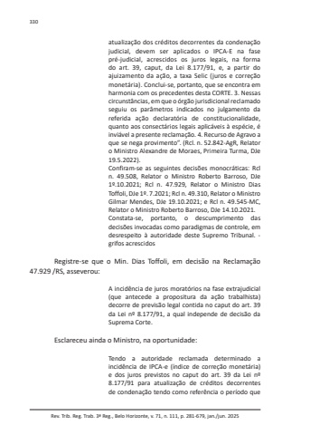 Rev. Trib. Reg. Trab. 3ª Reg., Belo Horizonte, v. 71, n. 111, p. 281-679, jan./jun. 2025330atualização dos créditos decorrentes da condenação judicial, devem ser aplicados o IPCA-E na fase pré-judicial, acrescidos os juros legais, na forma do art. 39, caput, da Lei 8.177/91, e, a partir do ajuizamento da ação, a taxa Selic (juros e correção monetária). Conclui-se, portanto, que se encontra em harmonia com os precedentes desta CORTE. 3. Nessas circunstâncias, em que o órgão jurisdicional reclamado seguiu os parâmetros indicados no julgamento da referida ação declaratória de constitucionalidade, quanto aos consectários legais aplicáveis à espécie, é inviável a presente reclamação. 4. Recurso de Agravo a que se nega provimento”. (Rcl. n. 52.842-AgR, Relator o Ministro Alexandre de Moraes, Primeira Turma, DJe 19.5.2022).Confiram-se as seguintes decisões monocráticas: Rcl n. 49.508, Relator o Ministro Roberto Barroso, DJe 1º.10.2021; Rcl n. 47.929, Relator o Ministro Dias Toffoli, DJe 1º. 7.2021; Rcl n. 49.310, Relator o Ministro Gilmar Mendes, DJe 19.10.2021; e Rcl n. 49.545-MC, Relator o Ministro Roberto Barroso, DJe 14.10.2021.Constata-se, portanto, o descumprimento das decisões invocadas como paradigmas de controle, em desrespeito à autoridade deste Supremo Tribunal. - grifos acrescidosRegistre-se que o Min. Dias Toffoli, em decisão na Reclamação 47.929 /RS, asseverou:A incidência de juros moratórios na fase extrajudicial (que antecede a propositura da ação trabalhista) decorre de previsão legal contida no caput do art. 39 da Lei nº 8.177/91, a qual independe de decisão da Suprema Corte.Esclareceu ainda o Ministro, na oportunidade:Tendo a autoridade reclamada determinado a incidência de IPCA-e (índice de correção monetária) e dos juros previstos no caput do art. 39 da Lei nº 8.177/91 para atualização de créditos decorrentes de condenação tendo como referência o período que