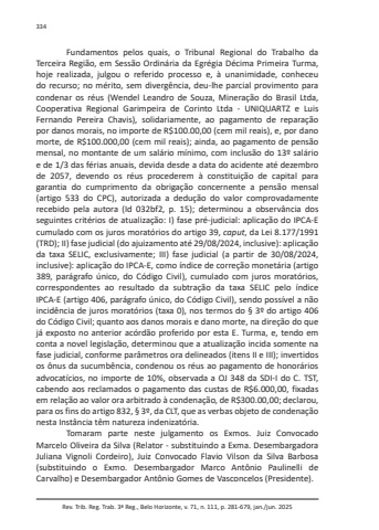 Rev. Trib. Reg. Trab. 3ª Reg., Belo Horizonte, v. 71, n. 111, p. 281-679, jan./jun. 2025334Fundamentos pelos quais, o Tribunal Regional do Trabalho da Terceira Região, em Sessão Ordinária da Egrégia Décima Primeira Turma, hoje realizada, julgou o referido processo e, à unanimidade, conheceu do recurso; no mérito, sem divergência, deu-lhe parcial provimento para condenar os réus (Wendel Leandro de Souza, Mineração do Brasil Ltda, Cooperativa Regional Garimpeira de Corinto Ltda - UNIQUARTZ e Luis Fernando Pereira Chavis), solidariamente, ao pagamento de reparação por danos morais, no importe de R$100.00,00 (cem mil reais), e, por dano morte, de R$100.000,00 (cem mil reais); ainda, ao pagamento de pensão mensal, no montante de um salário mínimo, com inclusão do 13º salário e de 1/3 das férias anuais, devida desde a data do acidente até dezembro de 2057, devendo os réus procederem à constituição de capital para garantia do cumprimento da obrigação concernente a pensão mensal (artigo 533 do CPC), autorizada a dedução do valor comprovadamente recebido pela autora (Id 032bf2, p. 15); determinou a observância dos seguintes critérios de atualização: I) fase pré-judicial: aplicação do IPCA-E cumulado com os juros moratórios do artigo 39, caput, da Lei 8.177/1991 (TRD); II) fase judicial (do ajuizamento até 29/08/2024, inclusive): aplicação da taxa SELIC, exclusivamente; III) fase judicial (a partir de 30/08/2024, inclusive): aplicação do IPCA-E, como índice de correção monetária (artigo 389, parágrafo único, do Código Civil), cumulado com juros moratórios, correspondentes ao resultado da subtração da taxa SELIC pelo índice IPCA-E (artigo 406, parágrafo único, do Código Civil), sendo possível a não incidência de juros moratórios (taxa 0), nos termos do § 3º do artigo 406 do Código Civil; quanto aos danos morais e dano morte, na direção do que já exposto no anterior acórdão proferido por esta E. Turma, e, tendo em conta a novel legislação, determinou que a atualização incida somente na fase judicial, conforme parâmetros ora delineados (itens II e III); invertidos os ônus da sucumbência, condenou os réus ao pagamento de honorários advocatícios, no importe de 10%, observada a OJ 348 da SDI-I do C. TST, cabendo aos reclamados o pagamento das custas de R$6.000,00, fixadas em relação ao valor ora arbitrado à condenação, de R$300.00,00; declarou, para os fins do artigo 832, § 3º, da CLT, que as verbas objeto de condenação nesta Instância têm natureza indenizatória.Tomaram parte neste julgamento os Exmos. Juiz Convocado Marcelo Oliveira da Silva (Relator - substituindo a Exma. Desembargadora Juliana Vignoli Cordeiro), Juiz Convocado Flavio Vilson da Silva Barbosa (substituindo o Exmo. Desembargador Marco Antônio Paulinelli de Carvalho) e Desembargador Antônio Gomes de Vasconcelos (Presidente).