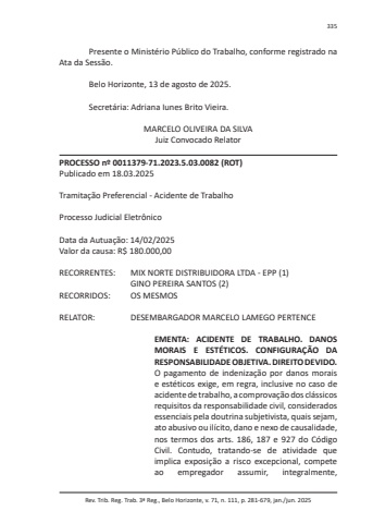 Rev. Trib. Reg. Trab. 3ª Reg., Belo Horizonte, v. 71, n. 111, p. 281-679, jan./jun. 2025335Presente o Ministério Público do Trabalho, conforme registrado na Ata da Sessão.Belo Horizonte, 13 de agosto de 2025.Secretária: Adriana Iunes Brito Vieira.MARCELO OLIVEIRA DA SILVAJuiz Convocado RelatorPROCESSO nº 0011379-71.2023.5.03.0082 (ROT)Publicado em 18.03.2025Tramitação Preferencial - Acidente de TrabalhoProcesso Judicial EletrônicoData da Autuação: 14/02/2025Valor da causa: R$ 180.000,00RECORRENTES: MIX NORTE DISTRIBUIDORA LTDA - EPP (1)GINO PEREIRA SANTOS (2)RECORRIDOS: OS MESMOSRELATOR: DESEMBARGADOR MARCELO LAMEGO PERTENCEEMENTA: ACIDENTE DE TRABALHO. DANOS MORAIS E ESTÉTICOS. CONFIGURAÇÃO DA RESPONSABILIDADE OBJETIVA. DIREITO DEVIDO.O pagamento de indenização por danos morais e estéticos exige, em regra, inclusive no caso de acidente de trabalho, a comprovação dos clássicos requisitos da responsabilidade civil, considerados essenciais pela doutrina subjetivista, quais sejam, ato abusivo ou ilícito, dano e nexo de causalidade, nos termos dos arts. 186, 187 e 927 do Código Civil. Contudo, tratando-se de atividade que implica exposição a risco excepcional, compete ao empregador assumir, integralmente,