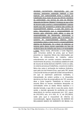 Rev. Trib. Reg. Trab. 3ª Reg., Belo Horizonte, v. 71, n. 111, p. 281-679, jan./jun. 2025359atividade normalmente desenvolvida, por sua natureza, apresentar exposição habitual a risco especial, com potencialidade lesiva e implicar ao trabalhador ônus maior do que aos demais membros da coletividade’, nos termos do voto do Ministro Alexandre de Moraes (Relator)’. Esclareça-se que o fato de terceiro apto a excluir a responsabilidade é apenas aquele que não componha o próprio tipo jurídico da responsabilidade objetiva - o que não ocorre nos autos. Naturalmente que a responsabilidade de terceiro pelo infortúnio pode afetar o grau de responsabilidade da Reclamada, diminuindo o montante indenizatório; porém não o irá excluir, em contexto de responsabilidade objetiva. Assim, constatados o dano, o nexo causal e a responsabilidade objetiva da Reclamada, há o dever de indenizar os Autores pelos danos morais suportados em face do acidente típico de trabalho que levou o ex-empregado a óbito. Desse modo, afirmando a Corte Regional, após minuciosa análise da prova, que se fazem presentes os requisitos fáticos das indenizações por fatores da infortunística do trabalho, adotar entendimento em sentido contrário demandaria o revolvimento de provas, circunstância vedada em sede de recurso de revista (Súmula 126/TST). Como se sabe, no sistema processual trabalhista, o exame da matéria fática dos autos é atribuição da Instância Ordinária, quer pelo Juiz de Primeiro Grau, quer pelo TRT. Sendo o recurso de revista um apelo de caráter extraordinário, em que se examinam potenciais nulidades, a interpretação da ordem jurídica e as dissensões decisórias em face da jurisprudência do TST, somente deve a Corte Superior Trabalhista se imiscuir no assunto fático se houver manifestos desajustes ou contradições entre os dados fáticos expostos e a decisão tomada, o que não é o caso dos autos. Assim sendo, a decisão agravada foi proferida em estrita observância às normas processuais (art. 557, caput, do CPC/1973; arts. 14 e 932, IV, ‘a’, do CPC/2015), razão pela qual é insuscetível de reforma ou reconsideração. Agravo desprovido. B) AGRAVO DO RECLAMADO BANCO DO NORDESTE DO BRASIL S.A.
