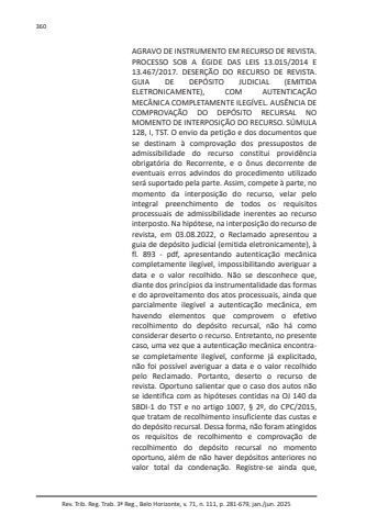 Rev. Trib. Reg. Trab. 3ª Reg., Belo Horizonte, v. 71, n. 111, p. 281-679, jan./jun. 2025360AGRAVO DE INSTRUMENTO EM RECURSO DE REVISTA. PROCESSO SOB A ÉGIDE DAS LEIS 13.015/2014 E 13.467/2017. DESERÇÃO DO RECURSO DE REVISTA. GUIA DE DEPÓSITO JUDICIAL (EMITIDA ELETRONICAMENTE), COM AUTENTICAÇÃO MECÂNICA COMPLETAMENTE ILEGÍVEL. AUSÊNCIA DE COMPROVAÇÃO DO DEPÓSITO RECURSAL NO MOMENTO DE INTERPOSIÇÃO DO RECURSO. SÚMULA 128, I, TST. O envio da petição e dos documentos que se destinam à comprovação dos pressupostos de admissibilidade do recurso constitui providência obrigatória do Recorrente, e o ônus decorrente de eventuais erros advindos do procedimento utilizado será suportado pela parte. Assim, compete à parte, no momento da interposição do recurso, velar pelo integral preenchimento de todos os requisitos processuais de admissibilidade inerentes ao recurso interposto. Na hipótese, na interposição do recurso de revista, em 03.08.2022, o Reclamado apresentou a guia de depósito judicial (emitida eletronicamente), à fl. 893 - pdf, apresentando autenticação mecânica completamente ilegível, impossibilitando averiguar a data e o valor recolhido. Não se desconhece que, diante dos princípios da instrumentalidade das formas e do aproveitamento dos atos processuais, ainda que parcialmente ilegível a autenticação mecânica, em havendo elementos que comprovem o efetivo recolhimento do depósito recursal, não há como considerar deserto o recurso. Entretanto, no presente caso, uma vez que a autenticação mecânica encontrase completamente ilegível, conforme já explicitado, não foi possível averiguar a data e o valor recolhido pelo Reclamado. Portanto, deserto o recurso de revista. Oportuno salientar que o caso dos autos não se identifica com as hipóteses contidas na OJ 140 da SBDI-1 do TST e no artigo 1007, § 2º, do CPC/2015, que tratam de recolhimento insuficiente das custas e do depósito recursal. Dessa forma, não foram atingidos os requisitos de recolhimento e comprovação de recolhimento do depósito recursal no momento oportuno, além de não haver depósitos anteriores no valor total da condenação. Registre-se ainda que,