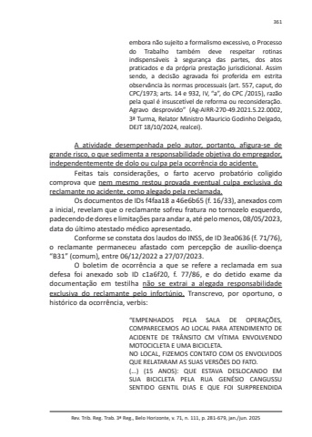 Rev. Trib. Reg. Trab. 3ª Reg., Belo Horizonte, v. 71, n. 111, p. 281-679, jan./jun. 2025361embora não sujeito a formalismo excessivo, o Processo do Trabalho também deve respeitar rotinas indispensáveis à segurança das partes, dos atos praticados e da própria prestação jurisdicional. Assim sendo, a decisão agravada foi proferida em estrita observância às normas processuais (art. 557, caput, do CPC/1973; arts. 14 e 932, IV, “a”, do CPC /2015), razão pela qual é insuscetível de reforma ou reconsideração. Agravo desprovido” (Ag-AIRR-270-49.2021.5.22.0002, 3ª Turma, Relator Ministro Mauricio Godinho Delgado, DEJT 18/10/2024, realcei).A atividade desempenhada pelo autor, portanto, afigura-se de grande risco, o que sedimenta a responsabilidade objetiva do empregador, independentemente de dolo ou culpa pela ocorrência do acidente.Feitas tais considerações, o farto acervo probatório coligido comprova que nem mesmo restou provada eventual culpa exclusiva do reclamante no acidente, como alegado pela reclamada.Os documentos de IDs f4faa18 a 46e6b65 (f. 16/33), anexados com a inicial, revelam que o reclamante sofreu fratura no tornozelo esquerdo, padecendo de dores e limitações para andar a, até pelo menos, 08/05/2023, data do último atestado médico apresentado.Conforme se constata dos laudos do INSS, de ID 3ea0636 (f. 71/76), o reclamante permaneceu afastado com percepção de auxílio-doença “B31” (comum), entre 06/12/2022 a 27/07/2023.O boletim de ocorrência a que se refere a reclamada em sua defesa foi anexado sob ID c1a6f20, f. 77/86, e do detido exame da documentação em testilha não se extrai a alegada responsabilidade exclusiva do reclamante pelo infortúnio. Transcrevo, por oportuno, o histórico da ocorrência, verbis:“EMPENHADOS PELA SALA DE OPERAÇÕES, COMPARECEMOS AO LOCAL PARA ATENDIMENTO DE ACIDENTE DE TRÂNSITO CM VÍTIMA ENVOLVENDO MOTOCICLETA E UMA BICICLETA.NO LOCAL, FIZEMOS CONTATO COM OS ENVOLVIDOS QUE RELATARAM AS SUAS VERSÕES DO FATO.(...) (15 ANOS): QUE ESTAVA DESLOCANDO EM SUA BICICLETA PELA RUA GENÉSIO CANGUSSU SENTIDO GENTIL DIAS E QUE FOI SURPREENDIDA