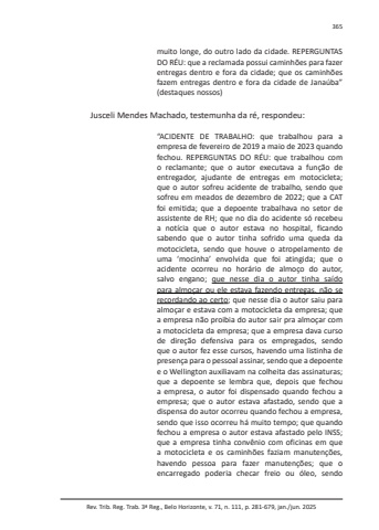 Rev. Trib. Reg. Trab. 3ª Reg., Belo Horizonte, v. 71, n. 111, p. 281-679, jan./jun. 2025365muito longe, do outro lado da cidade. REPERGUNTAS DO RÉU: que a reclamada possui caminhões para fazer entregas dentro e fora da cidade; que os caminhões fazem entregas dentro e fora da cidade de Janaúba” (destaques nossos)Jusceli Mendes Machado, testemunha da ré, respondeu:“ACIDENTE DE TRABALHO: que trabalhou para a empresa de fevereiro de 2019 a maio de 2023 quando fechou. REPERGUNTAS DO RÉU: que trabalhou com o reclamante; que o autor executava a função de entregador, ajudante de entregas em motocicleta; que o autor sofreu acidente de trabalho, sendo que sofreu em meados de dezembro de 2022; que a CAT foi emitida; que a depoente trabalhava no setor de assistente de RH; que no dia do acidente só recebeu a notícia que o autor estava no hospital, ficando sabendo que o autor tinha sofrido uma queda da motocicleta, sendo que houve o atropelamento de uma ‘mocinha’ envolvida que foi atingida; que o acidente ocorreu no horário de almoço do autor, salvo engano; que nesse dia o autor tinha saído para almoçar ou ele estava fazendo entregas, não se recordando ao certo; que nesse dia o autor saiu para almoçar e estava com a motocicleta da empresa; que a empresa não proibia do autor sair pra almoçar com a motocicleta da empresa; que a empresa dava curso de direção defensiva para os empregados, sendo que o autor fez esse cursos, havendo uma listinha de presença para o pessoal assinar, sendo que a depoente e o Wellington auxiliavam na colheita das assinaturas; que a depoente se lembra que, depois que fechou a empresa, o autor foi dispensado quando fechou a empresa; que o autor estava afastado, sendo que a dispensa do autor ocorreu quando fechou a empresa, sendo que isso ocorreu há muito tempo; que quando fechou a empresa o autor estava afastado pelo INSS; que a empresa tinha convênio com oficinas em que a motocicleta e os caminhões faziam manutenções, havendo pessoa para fazer manutenções; que o encarregado poderia checar freio ou óleo, sendo