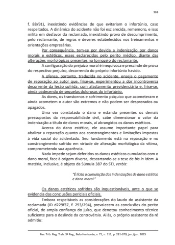 Rev. Trib. Reg. Trab. 3ª Reg., Belo Horizonte, v. 71, n. 111, p. 281-679, jan./jun. 2025369f. 88/91), inexistindo evidências de que evitariam o infortúnio, caso respeitados. A dinâmica do acidente não foi esclarecida, rememoro, e isso milita em desfavor da reclamada, inexistindo prova de descumprimento, pelo reclamante, de regras e deveres estabelecidos nos treinamentos e orientações empresárias.Por consequência, tem-se por devida a indenização por danos morais e estéticos, esses esclarecidos pelo perito médico, diante das alterações morfológicas presentes no tornozelo do reclamante.A configuração do prejuízo moral é inequívoca e prescinde de prova do respectivo prejuízo, decorrendo do próprio infortúnio havido.A ofensa, portanto, traduzida no acidente, enseja o pagamento de reparação ao autor que, frise-se, experimentou a dor incontroversa decorrente da lesão sofrida, com afastamento previdenciário e, frise-se, ainda padecendo de sequelas dolorosas do infortúnio.As dores, os transtornos e sofrimento psíquico que acometeram e ainda acometem o autor são extremos e não podem ser desprezados ou apagados.Uma vez constatado o dano e estando presentes os demais pressupostos da responsabilidade civil, cabe dimensionar o valor da indenização a título de danos morais, aí abrangidos os danos estéticos.Acerca do dano estético, ele assume importante papel para abalizar a reparação quanto aos constrangimentos e limitações impostas à vida social do acidentado. Seu fundamento está na reparação e no constrangimento sofrido em virtude de alteração morfológica da vítima, comprometendo sua aparência.Nada impede sejam deferidos os danos estéticos cumulados com o dano moral, face à origem diversa, descartando-se a tese de bis in idem. A matéria, inclusive, é objeto da Súmula 387 do STJ, verbis:“É lícita a cumulação das indenizações de dano estético e dano moral.”Os danos estéticos sofridos são inquestionáveis, ante o que se evidencia das conclusões periciais oficiais.Embora respeitáveis as considerações do laudo do assistente da reclamada (ID d229f37, f. 293/294), prevalecem as conclusões do perito oficial, de ampla confiança do juízo, que denotou conhecimento técnico suficiente para o deslinde da controvérsia. Aliás, o próprio assistente da ré admitiu: