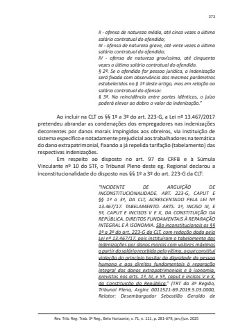 Rev. Trib. Reg. Trab. 3ª Reg., Belo Horizonte, v. 71, n. 111, p. 281-679, jan./jun. 2025373II - ofensa de natureza média, até cinco vezes o último salário contratual do ofendido;III - ofensa de natureza grave, até vinte vezes o último salário contratual do ofendido;IV - ofensa de natureza gravíssima, até cinquenta vezes o último salário contratual do ofendido.§ 2º. Se o ofendido for pessoa jurídica, a indenização será fixada com observância dos mesmos parâmetros estabelecidos no § 1º deste artigo, mas em relação ao salário contratual do ofensor.§ 3º. Na reincidência entre partes idênticas, o juízo poderá elevar ao dobro o valor da indenização.”Ao incluir na CLT os §§ 1º a 3º do art. 223-G, a Lei nº 13.467/2017 pretendeu abrandar as condenações dos empregadores nas indenizações decorrentes por danos morais impingidos aos obreiros, via instituição de sistema específico e notadamente prejudicial aos trabalhadores na temática do dano extrapatrimonial, fixando a já repelida tarifação (tabelamento) das respectivas indenizações.Em respeito ao disposto no art. 97 da CRFB e à Súmula Vinculante nº 10 do STF, o Tribunal Pleno deste eg. Regional declarou a inconstitucionalidade do disposto nos §§ 1º a 3º do art. 223-G da CLT:“INCIDENTE DE ARGUIÇÃO DE INCONSTITUCIONALIDADE. ART. 223-G, CAPUT E §§ 1º a 3º, DA CLT, ACRESCENTADO PELA LEI Nº 13.467/17. TABELAMENTO. ARTS. 1º, INCISO III, E 5º, CAPUT E INCISOS V E X, DA CONSTITUIÇÃO DA REPÚBLICA. DIREITOS FUNDAMENTAIS À REPARAÇÃO INTEGRAL E À ISONOMIA. São inconstitucionais os §§ 1º a 3º do art. 223-G da CLT, com redação dada pela Lei nº 13.467/17, pois instituíram o tabelamento das indenizações por danos morais com valores máximos a partir do salário recebido pela vítima, o que constitui violação do princípio basilar da dignidade da pessoa humana e aos direitos fundamentais à reparação integral dos danos extrapatrimoniais e à isonomia, previstos nos arts. 1º, III, e 5º, caput e incisos V e X, da Constituição da República.” (TRT da 3ª Região, Tribunal Pleno, ArgInc 0011521-69.2019.5.03.0000, Relator: Desembargador Sebastião Geraldo de