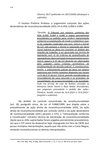 Rev. Trib. Reg. Trab. 3ª Reg., Belo Horizonte, v. 71, n. 111, p. 281-679, jan./jun. 2025374Oliveira, DEJT publicado em 20/7/2020) (destaquei e sublinhei)O Excelso Pretório finalizou o julgamento conjunto das ações declaratórias de inconstitucionalidade (ADI) nºs 6.050, 6.069 e 6.082:“Decisão: O Tribunal, por maioria, conheceu das ADIs 6.050, 6.069 e 6.082 e julgou parcialmente procedentes os pedidos para conferir interpretação conforme a Constituição, de modo a estabelecer que: 1) As redações conferidas aos arts. 223-A e 223-B, da CLT, não excluem o direito à reparação por dano moral indireto ou dano em ricochete no âmbito das relações de trabalho, a ser apreciado nos termos da legislação civil; 2) Os critérios de quantificação de reparação por dano extrapatrimonial previstos no art. 223-G, caput e § 1º, da CLT deverão ser observados pelo julgador como critérios orientativos de fundamentação da decisão judicial. É constitucional, porém, o arbitramento judicial do dano em valores superiores aos limites máximos dispostos nos incisos I a IV do § 1º do art. 223-G, quando consideradas as circunstâncias do caso concreto e os princípios da razoabilidade, da proporcionalidade e da igualdade. Tudo nos termos do voto do Relator, vencidos os Ministros Edson Fachin e Rosa Weber (Presidente), que julgavam procedente o pedido das ações. Plenário, Sessão Virtual de 16.6.2023 a 23.6.2023.” (negritei e sublinhei)No âmbito do controle concentrado de constitucionalidade [art. 28, parágrafo único, da Lei nº 9.868/1999, que dispõe sobre o procedimento da ação direta de inconstitucionalidade (ADI), da ação direta de inconstitucionalidade por omissão (ADO) e da ação declaratória de constitucionalidade (ADC) perante o STF], a “interpretação conforme a Constituição” constitui técnica de declaração de inconstitucionalidade (tanto que as ADIs supracitadas foram julgadas parcialmente procedentes), vez que o STF extrai do dispositivo legal impugnado em face da CRFB, que possui múltiplas interpretações, aquela que não atrita com a Carta Magna, restando inconstitucionais as demais interpretações: