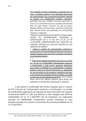 Rev. Trib. Reg. Trab. 3ª Reg., Belo Horizonte, v. 71, n. 111, p. 281-679, jan./jun. 2025376sem redução do texto impugnado, suspender-lhe, ex nunc, a eficácia quanto à sua aplicação decorrente da interpretação cuja inconstitucionalidade alegada se baseie em fundamento jurídico relevante, aplicação essa que, também, acarrete, periculum in mora ou a conveniência de ser suspensa até decisão final da ação direta.” (excerto do voto do Exmo. Ministro Relator Moreira Alves, proferido na MC-ADI 491, Tribunal Pleno, DJe publicado em 25/10/1991) (negritei e sublinhei)“EMENTA: AÇÃO DIRETA DE INCONSTITUCIONALIDADE. PEDIDO DE ‘INTERPRETAÇÃO CONFORME À CONSTITUIÇÃO’ DO § 2º DO ART. 33 DA LEI Nº 11.343/2006, CRIMINALIZADOR DAS CONDUTAS DE “INDUZIR, INSTIGAR OU AUXILIAR ALGUÉM AO USO INDEVIDO DE DROGA”.1. Cabível o pedido de ‘interpretação conforme à Constituição’ de preceito legal portador de mais de um sentido, dando-se que ao menos um deles é contrário à Constituição Federal.(...)5. Ação direta julgada procedente para dar ao § 2º do art. 33 da Lei 11.343/2006 ‘interpretação conforme à Constituição’ e dele excluir qualquer significado que enseje a proibição de manifestações e debates públicos acerca da descriminalização ou legalização do uso de drogas ou de qualquer substância que leve o ser humano ao entorpecimento episódico, ou então viciado, das suas faculdades psicofísicas.” (STF, Tribunal Pleno, ADI 4.274, Relator: Ministro Ayres Britto, DJe publicado em 02/05/2012) (destaquei e sublinhei)É perceptível a modificação dos limites impostos pela d. maioria do STF à técnica da “interpretação conforme a Constituição”, na ocasião do emblemático julgamento da arguição de descumprimento de preceito fundamental (ADPF) nº 130, que declarou a não recepção pela CRFB da integralidade da Lei nº 5.250/1967 (Lei de Imprensa), em julgamento ocorrido em 30/04/2009, notadamente quando analisadas as suas decisões exaradas em controle concentrado de constitucionalidade da Lei nº 13.467/2017: