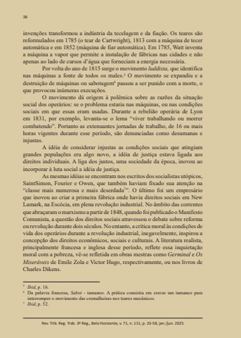 38Rev. Trib. Reg. Trab. 3ª Reg., Belo Horizonte, v. 71, n. 111, p. 33-58, jan./jun. 2025invenções transformou a indústria da tecelagem e da fiação. Os teares são reformulados em 1785 (o tear de Cartwright), 1813 com a máquina de tecer automática e em 1852 (máquina de fiar automática). Em 1785, Watt inventa a máquina a vapor que permite a instalação de fábricas nas cidades e não apenas ao lado de cursos d’água que forneciam a energia necessária.Por volta do ano de 1815 surge o movimento luddista, que identifica nas máquinas a fonte de todos os males.5 O movimento se expandiu e a destruição de máquinas ou sabotagem6 passou a ser punido com a morte, o que provocou inúmeras execuções.O movimento dá origem à polêmica sobre as razões da situação social dos operários: se o problema estaria nas máquinas, ou nas condições sociais em que essas eram usadas. Durante a rebelião operária de Lyon em 1831, por exemplo, levanta-se o lema “viver trabalhando ou morrer combatendo”. Portanto as extenuantes jornadas de trabalho, de 16 ou mais horas vigentes durante esse período, são denunciadas como desumanas e injustas.A idéia de considerar injustas as condições sociais que atingiam grandes populações era algo novo, a idéia de justiça estava ligada aos direitos individuais. A liga dos justos, uma sociedade da época, inovou ao incorporar à luta social a idéia de justiça.As mesmas idéias se encontram nos escritos dos socialistas utópicos, SaintSimon, Fourier e Owen, que também haviam fixado sua atenção na “classe mais numerosa e mais deserdada7”. O último foi um empresário que inovou ao criar a primeira fábrica onde havia direitos sociais em New Lamark, na Escócia, em plena revolução industrial. No âmbito das correntes que abraçaram o marxismo a partir de 1848, quando foi publicado o Manifesto Comunista, a questão dos direitos sociais atravessou o debate sobre reforma ou revolução durante dois séculos. No entanto, a crítica moral às condições de vida dos operários durante a revolução industrial, inegavelmente, inspirou a concepção dos direitos econômicos, sociais e culturais. A literatura realista, principalmente francesa e inglesa desse período, reflete essa inquietação moral com a pobreza, vê-se refletida em obras mestras como Germinal e Os Miseráveis de Emile Zola e Victor Hugo, respectivamente, ou nos livros de Charles Dikens.5 Ibid, p. 16. 6 Da palavra francesa, Sabot - tamanco. A prática consistia em cravar um tamanco para interromper o movimento das cremalheiras nos teares mecânicos. 7 Ibid, p. 52.