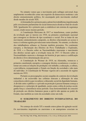 39Rev. Trib. Reg. Trab. 3ª Reg., Belo Horizonte, v. 71, n. 111, p. 33-58, jan./jun. 2025No entanto vemos que o movimento pelo sufrágio universal, hoje amplamente reconhecido como um requisito da democracia moderna e um direito eminentemente político, foi encampado pelo movimento sindical desde meados do século XIX.A Alemanha foi o primeiro país a adotar leis trabalhistas impulsionada pelo crescimento parlamentar da social democracia alemã ao final do século XIX. Igualmente foi o primeiro país a estabelecer um sistema de segurança social, criado nesse mesmo período.A Constituição Mexicana de 1917 se transformou, como produto da revolução que se iniciou em 1910, na primeira constituição nacional que consagrou os direitos de tipo econômico e social. Por se tratar de um movimento eminentemente camponês, os direitos relacionados ao acesso à terra e à reforma agrária prevaleceram notavelmente. No entanto, os direitos dos trabalhadores urbanos se fizeram também presentes. No continente europeu, a Declaração dos Direitos do Povo Trabalhador e Explorado, de 1918, e o Decreto sobre as Nacionalidades marcaram o nascimento dos direitos sociais após a revolução russa de 1917. O Decreto sobre as Nacionalidades mereceu o destaque da história já que marca a codificação do direito à livre determinação dos povos.A Constituição de Weimar de 1919, na Alemanha, tornou-se a primeira constituição européia a consagrar direitos econômicos e sociais e tomar em conta as relações de produção e de trabalho, a educação, a cultura, a previdência, reorganizando o Estado em função da sociedade e não mais do indivíduo. A Constituição de Weimar vigorou até a ascensão do regime nazista em 1933.Portanto as preocupações sociais surgidas do contexto da revolução industrial e da escravidão nas colônias marcam a afirmação de uma consciência coletiva que reconhece a dimensão social da dignidade humana. A divisão entre o público e o privado na proteção à pessoa humana começa a desaparecer e o princípio de igualdade, assim como a idéia de justiça social, ganha força e consistência nesse período. Essa horizontalidade do conceito de proteção aos direitos humanos passa a opô-lo não apenas ao poder do Estado, mas também ao resto da sociedade como um todo.O SURGIMENTO DO DIREITO INTERNACIONAL DO TRABALHONo começo do século XX o mundo estava pleno de agitação social. Os movimentos inspirados no marxismo e no anarquismo cresciam no
