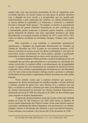 40Rev. Trib. Reg. Trab. 3ª Reg., Belo Horizonte, v. 71, n. 111, p. 33-58, jan./jun. 2025mundo todo, com suas previsões pessimistas de fim do capitalismo pela revolução operária. Ao mesmo tempo era uma época de grande otimismo com a chegada do novo século e a prosperidade que era gerada pela industrialização e pela exploração das colônias. As cidades proliferavam, as classes médias se expandiam e se refinavam, o comércio e a indústria moviam a chamada “belle époque”. No entanto, as tensões se acumulavam e essa época de grande otimismo desembocou na pior carnificina que a humanidade jamais conhecera; a primeira guerra mundial, a primeira guerra industrial da história com uma capacidade destrutiva até então desconhecida. A revolução triunfou na Rússia em 1917 e entre 1918 e 1923 várias revoluções eclodiram na Alemanha, Hungria, Polônia, entre outros países.Para responder a essa realidade, a comunidade internacional impulsionou a fundação da Organização Internacional do Trabalho no Tratado de Versailles em 1919. A partir de sua estrutura tripartite, a OIT buscava conciliar os setores sociais em aberta confrontação e, por meio de concessões sociais coordenadas em vários países, estender a pacificação alcançada no plano internacional ao meio social em plena convulsão.A estrutura tripartite refletia, portanto, o espírito de diálogo social, sob a mediação dos governos que pretendia ser o mecanismo de conciliação dos setores envolvidos. A estrutura reflete o reconhecimento das desigualdades sociais. A resposta foi criar mecanismos de concepção de direitos de forma cooperada. Nesse sentido o aprofundamento da democracia e das liberdades civis foi visto como essencial para o diálogo social e, portanto, o princípio da liberdade de associação e organização sindical encontrou seu mais sólido baluarte.Nesse sentido, vemos que o contexto histórico que marcou o surgimento do direito internacional do trabalho impediu a divisão artificial e confusa, produto da guerra fria, entre direitos civis e políticos por um lado, e econômicos sociais e culturais por outro. Essa diferenciação ocorrida no sistema internacional de proteção aos direitos humanos fragmentou a declaração universal de 1948 nos dois pactos de 1966, em dois tratados para cada conjunto de direitos fundamentais.A expressão direitos humanos ainda não existia, tendo sido cunhada apenas na Carta de São Francisco em 1945 onde elenca as funções da recém-criada Organização das Nações Unidas. Entre essas funções aparece a proteção e promoção dos direitos humanos, sem que houvesse, no entanto, qualquer tratado ou declaração que definisse o que eram direitos humanos. Como sabemos essa somente veio à luz no dia 10 de dezembro de 1948.