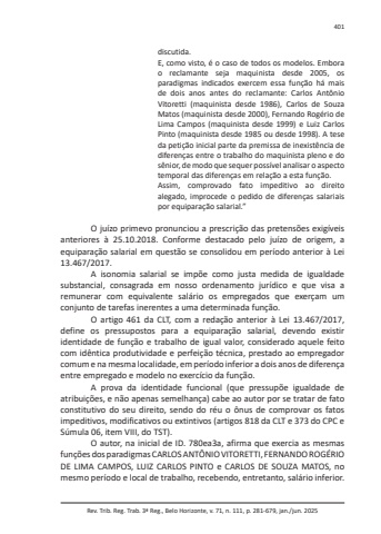 Rev. Trib. Reg. Trab. 3ª Reg., Belo Horizonte, v. 71, n. 111, p. 281-679, jan./jun. 2025401discutida.E, como visto, é o caso de todos os modelos. Embora o reclamante seja maquinista desde 2005, os paradigmas indicados exercem essa função há mais de dois anos antes do reclamante: Carlos Antônio Vitoretti (maquinista desde 1986), Carlos de Souza Matos (maquinista desde 2000), Fernando Rogério de Lima Campos (maquinista desde 1999) e Luiz Carlos Pinto (maquinista desde 1985 ou desde 1998). A tese da petição inicial parte da premissa de inexistência de diferenças entre o trabalho do maquinista pleno e do sênior, de modo que sequer possível analisar o aspecto temporal das diferenças em relação a esta função.Assim, comprovado fato impeditivo ao direito alegado, improcede o pedido de diferenças salariais por equiparação salarial.”O juízo primevo pronunciou a prescrição das pretensões exigíveis anteriores à 25.10.2018. Conforme destacado pelo juízo de origem, a equiparação salarial em questão se consolidou em período anterior à Lei 13.467/2017.A isonomia salarial se impõe como justa medida de igualdade substancial, consagrada em nosso ordenamento jurídico e que visa a remunerar com equivalente salário os empregados que exerçam um conjunto de tarefas inerentes a uma determinada função.O artigo 461 da CLT, com a redação anterior à Lei 13.467/2017, define os pressupostos para a equiparação salarial, devendo existir identidade de função e trabalho de igual valor, considerado aquele feito com idêntica produtividade e perfeição técnica, prestado ao empregador comum e na mesma localidade, em período inferior a dois anos de diferença entre empregado e modelo no exercício da função.A prova da identidade funcional (que pressupõe igualdade de atribuições, e não apenas semelhança) cabe ao autor por se tratar de fato constitutivo do seu direito, sendo do réu o ônus de comprovar os fatos impeditivos, modificativos ou extintivos (artigos 818 da CLT e 373 do CPC e Súmula 06, item VIII, do TST).O autor, na inicial de ID. 780ea3a, afirma que exercia as mesmas funções dos paradigmas CARLOS ANTÔNIO VITORETTI, FERNANDO ROGÉRIO DE LIMA CAMPOS, LUIZ CARLOS PINTO e CARLOS DE SOUZA MATOS, no mesmo período e local de trabalho, recebendo, entretanto, salário inferior.