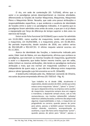 Rev. Trib. Reg. Trab. 3ª Reg., Belo Horizonte, v. 71, n. 111, p. 281-679, jan./jun. 2025402O réu, em sede de contestação (ID. 7c2f1dd), afirma que o autor e os paradigmas jamais desempenharam as mesmas atividades, diferenciando as funções de Auxiliar Maquinista, Maquinista, Maquinista Pleno e Maquinista Sênior. Ressalta, que cada uma possui atribuições e responsabilidades específicas, o que evidencia a ausência de identidade de funções entre o autor e os paradigmas indicados. A ré aponta que os paradigmas foram admitidos anos antes do autor, o que por si só já afasta a equiparação por força da diferença de tempo superior a dois anos no exercício da função.Extrai-se da ficha funcional (Id 922bb42) que o autor foi admitido em 15.03.2001, como auxiliar de maquinista, tendo sido promovido a maquinista, em 01/04/2005, e a maquinista pleno, em 01.08.2011. No período imprescrito, desde outubro de 2018, seu salário variou de R$2.045,89 a R$2.437,91. O último reajuste salarial ocorreu em 01.11.2021.Acerca da identidade das funções, a testemunha indicada pelo autor, Odair José de Matos, em seu depoimento, afirmou que conhece os paradigmas, que exerciam as mesmas funções de maquinista, igualmente o autor e o depoente; que todos faziam mesmo trecho; que ele saiba, todos tinham as mesmas atribuições, não tendo os paradigmas nenhuma atribuição a mais; que era normal um maquinista substituir o outro, independente de quem seja; e, que não tem diferença entre maquinista pleno e sênior (gravação cujo link encontra-se no ID. 333ae90).A testemunha indicada pelo réu, Weberson Leonardo de Oliveira, nos autos da prova emprestada afirmou (ID. f1821c0 - Pág. 4):“que trabalha na ré desde 1996, atualmente é especialista, desde outubro de 2022, sendo que antes estava como maquinista “sênior”, “pleno” e “júnior”, vez que o depoente entrou na empresa como auxiliar de maquinista; maquinista sempre atua em viagens e manobras; o depoente sempre atuou, sob as três nomenclaturas, nos trechos Lafaiete/BH, Lafaiete/Itabirito e Lafaiete/Jeceaba; conforme vão adquirindo algumas responsabilidades a mais, o maquinista vai progredindo na carreira; quando passou de junior para pleno, passou a também passar treinamento, melhor dizendo, monitoria, acompanhando os auxiliares, o que não fazia como maquinista “junior”; quando passou de pleno para “sênior”, passou a