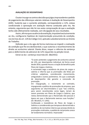 Rev. Trib. Reg. Trab. 3ª Reg., Belo Horizonte, v. 71, n. 111, p. 281-679, jan./jun. 2025404AVALIAÇÃO DE DESEMPENHOO autor insurge-se contra a decisão que julgou improcedente o pedido de pagamento das diferenças salariais relativas à Avaliação de Desempenho (ADE). Sustenta que o aumento pleiteado, correspondente a 12%, estava condicionado à aprovação em avaliação interna conduzida pelo réu. No entanto, argumenta que não há nos autos comprovação de que a avaliação tenha sido efetivamente realizada, com divulgação de seus resultados.Assim, afirma que a ausência da avaliação, imputável exclusivamente ao réu, configuraria hipótese de implementação presumida da condição, nos termos do art. 129 do Código Civil, aplicado subsidiariamente ao Direito do Trabalho.Defende que o réu agiu de forma maliciosa ao impedir a realização da condição que lhe era desfavorável, o que autoriza o reconhecimento do direito ao acréscimo salarial. Diante disso, requer a reforma da sentença para o deferimento do adicional de 12% requerido na petição inicial.Extrai-se da r. sentença recorrida (ID. 38e2455):“O autor pretende o pagamento de acréscimo salarial de 12%, por desempenho individual, de forma anual desde 2016, quando houve a criação do benefício pelo Plano de Cargos e Salários.A reclamada nega a existência de plano de cargos e salários e informa que as promoções são feitas por critérios subjetivos, considerando merecimento, antiguidade e outros parâmetros. Diz que a avaliação de desempenho não garante a concessão de promoção.Em impugnação, o reclamante se contradiz, impugnando a política de promoções da empresa, que argumenta ser discriminatória e que “tais critérios, para serem reconhecidos como legais, teriam de serem previstos em Plano de Cargos e Salários, que restou demonstrado que a Reclamada não possuía à época em que o Reclamante exerceu suas funções.” (ID. 961d321, fl. 1291).Confessada a inexistência de Plano de Cargos e Salários e considerando que tampouco demonstrada a existência de normativo interno que preveja direito às promoções vindicadas, o pedido do reclamante carece de fundamento normativo. Improcede.”