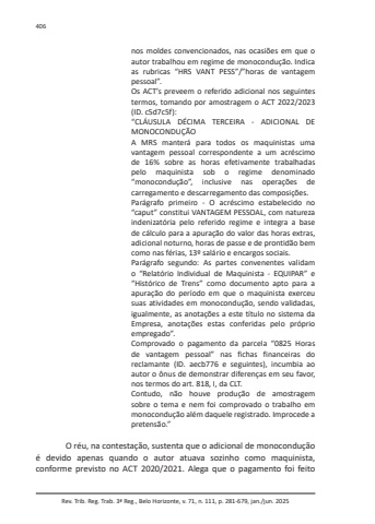 Rev. Trib. Reg. Trab. 3ª Reg., Belo Horizonte, v. 71, n. 111, p. 281-679, jan./jun. 2025406nos moldes convencionados, nas ocasiões em que o autor trabalhou em regime de monocondução. Indica as rubricas “HRS VANT PESS”/”horas de vantagem pessoal”.Os ACT’s preveem o referido adicional nos seguintes termos, tomando por amostragem o ACT 2022/2023 (ID. c5d7c5f):“CLÁUSULA DÉCIMA TERCEIRA - ADICIONAL DE MONOCONDUÇÃOA MRS manterá para todos os maquinistas uma vantagem pessoal correspondente a um acréscimo de 16% sobre as horas efetivamente trabalhadas pelo maquinista sob o regime denominado “monocondução”, inclusive nas operações de carregamento e descarregamento das composições.Parágrafo primeiro - O acréscimo estabelecido no “caput” constitui VANTAGEM PESSOAL, com natureza indenizatória pelo referido regime e integra a base de cálculo para a apuração do valor das horas extras, adicional noturno, horas de passe e de prontidão bem como nas férias, 13º salário e encargos sociais.Parágrafo segundo: As partes convenentes validam o “Relatório Individual de Maquinista - EQUIPAR” e “Histórico de Trens” como documento apto para a apuração do período em que o maquinista exerceu suas atividades em monocondução, sendo validadas, igualmente, as anotações a este título no sistema da Empresa, anotações estas conferidas pelo próprio empregado”.Comprovado o pagamento da parcela “0825 Horas de vantagem pessoal” nas fichas financeiras do reclamante (ID. aecb776 e seguintes), incumbia ao autor o ônus de demonstrar diferenças em seu favor, nos termos do art. 818, I, da CLT.Contudo, não houve produção de amostragem sobre o tema e nem foi comprovado o trabalho em monocondução além daquele registrado. Improcede a pretensão.”O réu, na contestação, sustenta que o adicional de monocondução é devido apenas quando o autor atuava sozinho como maquinista, conforme previsto no ACT 2020/2021. Alega que o pagamento foi feito