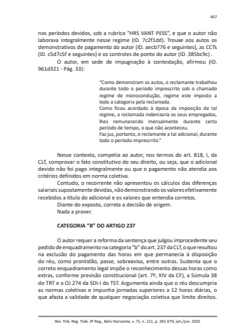 Rev. Trib. Reg. Trab. 3ª Reg., Belo Horizonte, v. 71, n. 111, p. 281-679, jan./jun. 2025407nos períodos devidos, sob a rubrica “HRS VANT PESS”, e que o autor não laborava integralmente nesse regime (ID. 7c2f1dd). Trouxe aos autos os demonstrativos de pagamento do autor (ID. aecb776 e seguintes), as CCTs (ID. c5d7c5f e seguintes) e os controles de ponto do autor (ID. 385bc9c) .O autor, em sede de impugnação à contestação, afirmou (ID. 961d321 - Pág. 33):“Como demonstram os autos, o reclamante trabalhou durante todo o período imprescrito sob o chamado regime de monocondução, regime este imposto a toda a categoria pela reclamada.Como ficou acordado à época da imposição de tal regime, a reclamada indenizaria os seus empregados, lhes remunerando mensalmente durante certo período de tempo, o que não aconteceu.Faz jus, portanto, o reclamante a tal adicional, durante todo o período imprescrito.”Nesse contexto, competia ao autor, nos termos do art. 818, I, da CLT, comprovar o fato constitutivo do seu direito, ou seja, que o adicional devido não foi pago integralmente ou que o pagamento não atendia aos critérios definidos em norma coletiva.Contudo, o recorrente não apresentou os cálculos das diferenças salariais supostamente devidas, não demonstrando os valores efetivamente recebidos a título do adicional e os valores que entendia corretos.Diante do exposto, correta a decisão de origem.Nada a prover.CATEGORIA “B” DO ARTIGO 237O autor requer a reforma da sentença que julgou improcedente seu pedido de enquadramento na categoria “b” do art. 237 da CLT, o que resultou na exclusão do pagamento das horas em que permanecia à disposição do réu, como prontidão, passe, sobreaviso, entre outras. Sustenta que o correto enquadramento legal impõe o reconhecimento dessas horas como extras, conforme previsão constitucional (art. 7º, XIV da CF), a Súmula 38 do TRT e a OJ 274 da SDI-I do TST. Argumenta ainda que o réu descumpria as normas coletivas e impunha jornadas superiores a 12 horas diárias, o que afasta a validade de qualquer negociação coletiva que limite direitos.
