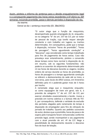 Rev. Trib. Reg. Trab. 3ª Reg., Belo Horizonte, v. 71, n. 111, p. 281-679, jan./jun. 2025408Assim, pleiteia a reforma da sentença para o devido enquadramento legal e o consequente pagamento das horas extras excedentes à 6ª diária ou 36ª semanal, incluindo prontidão, passe e demais períodos à disposição do réu.Ao exame.Extrai-se da r. sentença recorrida (ID. 38e2455):“O autor alega que a função de maquinista, desempenhada quando empregado da ré, enquadrase na categoria “b” do art. 237 da CLT, por se tratar de pessoal de tração, cuja tarefa requer atenção constante e com trabalho em lugares ou trechos determinados. Em consequência, pede que o tempo à disposição, inclusive “horas de prontidão”, “horas de passagem”, “horas aguardando condução” e “descanso”, seja considerado como tempo trabalhado para fins de pagamento de horas extras. Caso não prevaleça esse entendimento, pleiteia a conversão desse tempo como hora normal à disposição da ré, em resumo, sob os seguintes fundamentos: não poderia se ausentar do alojamento determinado pela ré nas horas de descanso durante as viagens; recebia ordens de serviço durante as horas de prontidão; as horas de passagem e o tempo aguardando condução se referem a deslocamentos da sede até os trens, e vice-versa, para locais de difícil acesso, em itinerários definidos pela ré e podendo gastar mais de 5 horas por trecho.A reclamada alega que o maquinista enquadrase como equipagem de trem em geral, isto é, à previsão da categoria “c” do art. 237 da CLT, por exercer atividades essencialmente a bordo. Invoca a previsão em norma coletiva e a Súmula 446 do TST. E, por consequência, defende a validade da exclusão dos períodos alegados pelo reclamante do tempo à disposição do empregador para fins de cômputo da jornada de trabalho. Quanto aos pedidos sucessivos do autor, destaca que a prontidão, horas de passe e de espera pelo transporte foram remuneradas conforme previsão legal, sendo incompatível o seu pagamento com a atual previsão do art. 4º da CLT. Nega a possibilidade de deslocamento durante o descanso fora do local de lotação.