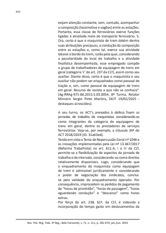 Rev. Trib. Reg. Trab. 3ª Reg., Belo Horizonte, v. 71, n. 111, p. 281-679, jan./jun. 2025412exijam atenção constante, sem, contudo, acompanhar a composição (locomotiva e vagões) entre as estações. Portanto, essa classe de ferroviários exerce funções ligadas à atividade meio do transporte ferroviário. 5. Ora, certo é que o maquinista de trem detém dentre suas atribuições precípuas, a condução da composição entre as estações e, como tal, exerce sua atividade laboral a bordo do trem, razão pela qual, considerando a peculiaridade do local de trabalho e a atividade finalística desempenhada, esse empregado compõe o grupo de trabalhadores de equipagem de trens em geral (categoria ‘c’ do art. 237 da CLT), assim como seu auxiliar. Diante disso, certo é que o maquinista e seu auxiliar não podem ser enquadrados como pessoal de tração e, sim, como pessoal de equipagem de trens em geral. Recurso de revista a que não se conhece”. (Ag-RRAg-971-86.2015.5.03.0054, 8ª Turma, Relator Ministro Sergio Pinto Martins, DEJT 19/02/2025 - destaques acrescidos).A seu turno, os ACT’s anexados à defesa fixam as jornadas de trabalho de maquinistas considerando-os como integrantes da categoria de equipagens de trens em geral, dentre os prestadores de serviços ferroviários. Veja-se, por exemplo, a cláusula 34ª do ACT 2018/2019 (ID. 31a63ed).Tendo em vista o Tema de Repercussão Geral nº 1046 e as inovações implementadas pela Lei nº 13.467/2017 (Reforma Trabalhista) no art. 611-A, I e III da CLT, permite-se a flexibilização de aspectos da jornada de trabalho e do intervalo, considerando-os como direitos relativamente disponíveis. Logo, considerando que o enquadramento do maquinista como equipagem de trem é admissível juridicamente e considerando o poder de negociação dos sindicatos, concluise pela validade do enquadramento operado. Por consequência, improcedem os pedidos de pagamento de “horas de prontidão”, “horas de passagem”, “horas aguardando condução” e “descanso” como horas extras.Por força do art. 238, §1º, da CLT, é indevida a incorporação do tempo gasto em deslocamentos da