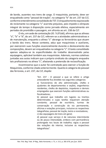 Rev. Trib. Reg. Trab. 3ª Reg., Belo Horizonte, v. 71, n. 111, p. 281-679, jan./jun. 2025414de bordo, ausentes nos trens de carga. O maquinista, portanto, deve ser enquadrado como “pessoal de tração”, na categoria “b” do art. 237 da CLT, conforme entendimento consolidado do TST. O enquadramento equivocado do reclamante na categoria “c” acarreta prejuízos, pois impede o cômputo integral do tempo à disposição como jornada efetiva, especialmente em períodos de prontidão e passagem, em afronta ao art. 238 da CLT.O réu, em sede de contestação (ID. 7c2f1dd), afirmou que as alíneas “a”, “b” e “d”, do art. 237 da CLT, referem-se a atividades administrativas e de manutenção, enquanto a alínea “c” abrange os ferroviários que atuam a bordo dos trens. Nesse contexto, aduz que maquinistas e auxiliares, por exercerem suas funções essencialmente durante o deslocamento das composições, devem ser enquadrados na categoria “c”. O texto consolidado apenas adaptou-se às especificidades do trabalho desenvolvido pelas equipagens, aplicável também aos maquinistas. Ademais, normas coletivas juntadas aos autos indicam que o próprio sindicato da categoria enquadra tais profissionais na alínea “c”, afastando a pretensão de reclassificação.Incontroverso que o autor foi contratado para exercer a função de Maquinista, conforme citado anteriormente. Quanto à categoria do pessoal das ferrovias, o art. 237, da CLT, dispõe:“Art. 237 - O pessoal a que se refere o artigo antecedente fica dividido nas seguintes categorias:a) funcionários de alta administração, chefes e ajudantes de departamentos e seções, engenheiros residentes, chefes de depósitos, inspetores e demais empregados que exercem funções administrativas ou fiscalizadoras;b) pessoal que trabalhe em lugares ou trechos determinados e cujas tarefas requeiram atenção constante; pessoal de escritório, turmas de conservação e construção da via permanente, oficinas e estações principais, inclusive os respectivos telegrafistas; pessoal de tração, lastro e revistadores;c) das equipagens de trens em geral;d) pessoal cujo serviço é de natureza intermitente ou de pouca intensidade, embora com permanência prolongada nos locais de trabalho; vigias e pessoal das estações do interior, inclusive os respectivos telegrafistas”.