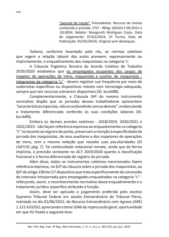 Rev. Trib. Reg. Trab. 3ª Reg., Belo Horizonte, v. 71, n. 111, p. 281-679, jan./jun. 2025416“pessoal de tração”. Precedentes. Recurso de revista conhecido e provido. (TST - RRAg: 0010217-09.2015.5 .03.0054, Relator: Margareth Rodrigues Costa, Data de Julgamento: 07/02/2024, 2ª Turma, Data de Publicação: 01/03/2024). Original sem destaques.Todavia, conforme levantado pelo réu, as normas coletivas que regem a relação laboral dos autos preveem, expressamente ou implicitamente, o enquadramento dos maquinistas na categoria ‘c’.A Cláusula Trigésima Terceira do Acordo Coletivo de Trabalho 2019/2020 estabelece que os empregados ocupantes dos cargos de inspetor de operações de trens, maquinista e auxiliar de maquinista - integrantes da categoria “c” - devem registrar sua frequência por meio de cadernetas específicas ou dispositivos móveis com tecnologia adequada, sempre que tais recursos estiverem disponíveis (ID. bcc4df8).Complementarmente, a Cláusula 34ª do mesmo instrumento normativo dispõe que as jornadas desses trabalhadores apresentam “características especiais, não se confundindo com as demais”, evidenciando o tratamento diferenciado conferido às suas condições laborais (ID. bcc4df8).Embora os demais acordos coletivos - 2018/2019, 2020/2021 e 2022/2023 - não façam referência expressa ao enquadramento na categoria “c” no tocante ao registro de ponto, preservam a menção à especificidade da jornada dos maquinistas, de seus auxiliares e dos inspetores de operações de trens, com a mesma redação que ressalta suas peculiaridades (ID c5d7c5f, pág. 7). Tal continuidade redacional remete, ainda que de forma implícita, à previsão constante no ACT 2019/2020 quanto à classificação funcional e à forma diferenciada de registro da jornada.Além disso, todos os instrumentos coletivos mencionados fazem referência expressa, no §2º da cláusula sobre a jornada dos maquinistas, ao §5º do artigo 238 da CLT dispositivo que trata especificamente da concessão do intervalo intrajornada para empregados enquadrados na categoria “c” - reforçando, assim, o reconhecimento normativo desse enquadramento e o tratamento jurídico específico atribuído à função.Assim, deve ser aplicado o julgamento proferido pelo excelso Supremo Tribunal Federal em sessão Extraordinária do Tribunal Pleno, realizada no dia 02/06/2022, do Recurso Extraordinário com Agravo (ARE) 1.121.633/GO, apreciando o tema 1046 da repercussão geral, oportunidade em que foi fixada a seguinte tese: