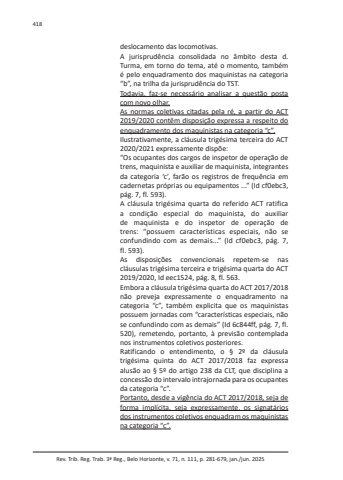 Rev. Trib. Reg. Trab. 3ª Reg., Belo Horizonte, v. 71, n. 111, p. 281-679, jan./jun. 2025418deslocamento das locomotivas.A jurisprudência consolidada no âmbito desta d. Turma, em torno do tema, até o momento, também é pelo enquadramento dos maquinistas na categoria “b”, na trilha da jurisprudência do TST.Todavia, faz-se necessário analisar a questão posta com novo olhar.As normas coletivas citadas pela ré, a partir do ACT 2019/2020 contêm disposição expressa a respeito do enquadramento dos maquinistas na categoria “c”.Ilustrativamente, a cláusula trigésima terceira do ACT 2020/2021 expressamente dispõe:“Os ocupantes dos cargos de inspetor de operação de trens, maquinista e auxiliar de maquinista, integrantes da categoria ‘c’, farão os registros de frequência em cadernetas próprias ou equipamentos ...” (Id cf0ebc3, pág. 7, fl. 593).A cláusula trigésima quarta do referido ACT ratifica a condição especial do maquinista, do auxiliar de maquinista e do inspetor de operação de trens: “possuem características especiais, não se confundindo com as demais...” (Id cf0ebc3, pág. 7, fl. 593).As disposições convencionais repetem-se nas cláusulas trigésima terceira e trigésima quarta do ACT 2019/2020, Id eec1524, pág. 8, fl. 563.Embora a cláusula trigésima quarta do ACT 2017/2018 não preveja expressamente o enquadramento na categoria “c”, também explicita que os maquinistas possuem jornadas com “características especiais, não se confundindo com as demais” (Id 6c844ff, pág. 7, fl. 520), remetendo, portanto, à previsão contemplada nos instrumentos coletivos posteriores.Ratificando o entendimento, o § 2º da cláusula trigésima quinta do ACT 2017/2018 faz expressa alusão ao § 5º do artigo 238 da CLT, que disciplina a concessão do intervalo intrajornada para os ocupantes da categoria “c”.Portanto, desde a vigência do ACT 2017/2018, seja de forma implícita, seja expressamente, os signatários dos instrumentos coletivos enquadram os maquinistas na categoria “c”.