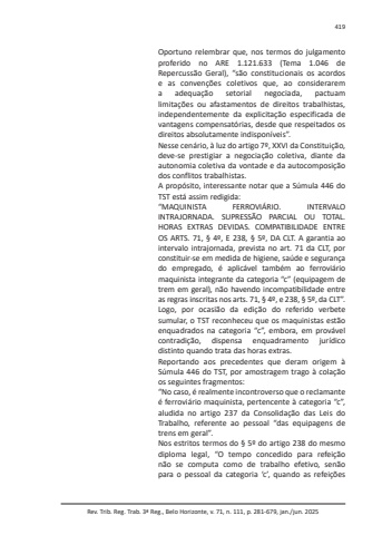 Rev. Trib. Reg. Trab. 3ª Reg., Belo Horizonte, v. 71, n. 111, p. 281-679, jan./jun. 2025419Oportuno relembrar que, nos termos do julgamento proferido no ARE 1.121.633 (Tema 1.046 de Repercussão Geral), “são constitucionais os acordos e as convenções coletivos que, ao considerarem a adequação setorial negociada, pactuam limitações ou afastamentos de direitos trabalhistas, independentemente da explicitação especificada de vantagens compensatórias, desde que respeitados os direitos absolutamente indisponíveis”.Nesse cenário, à luz do artigo 7º, XXVI da Constituição, deve-se prestigiar a negociação coletiva, diante da autonomia coletiva da vontade e da autocomposição dos conflitos trabalhistas.A propósito, interessante notar que a Súmula 446 do TST está assim redigida:“MAQUINISTA FERROVIÁRIO. INTERVALO INTRAJORNADA. SUPRESSÃO PARCIAL OU TOTAL. HORAS EXTRAS DEVIDAS. COMPATIBILIDADE ENTRE OS ARTS. 71, § 4º, E 238, § 5º, DA CLT. A garantia ao intervalo intrajornada, prevista no art. 71 da CLT, por constituir-se em medida de higiene, saúde e segurança do empregado, é aplicável também ao ferroviário maquinista integrante da categoria “c” (equipagem de trem em geral), não havendo incompatibilidade entre as regras inscritas nos arts. 71, § 4º, e 238, § 5º, da CLT”.Logo, por ocasião da edição do referido verbete sumular, o TST reconheceu que os maquinistas estão enquadrados na categoria “c”, embora, em provável contradição, dispensa enquadramento jurídico distinto quando trata das horas extras.Reportando aos precedentes que deram origem à Súmula 446 do TST, por amostragem trago à colação os seguintes fragmentos:“No caso, é realmente incontroverso que o reclamante é ferroviário maquinista, pertencente à categoria “c”, aludida no artigo 237 da Consolidação das Leis do Trabalho, referente ao pessoal “das equipagens de trens em geral”.Nos estritos termos do § 5º do artigo 238 do mesmo diploma legal, “O tempo concedido para refeição não se computa como de trabalho efetivo, senão para o pessoal da categoria ‘c’, quando as refeições