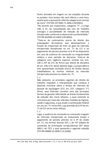 Rev. Trib. Reg. Trab. 3ª Reg., Belo Horizonte, v. 71, n. 111, p. 281-679, jan./jun. 2025420forem tomadas em viagem ou nas estações durante as paradas. Esse tempo não será inferior a uma hora, exceto para o pessoal da referida categoria em serviço de trens” (TST-RR-1977600-71.2006.5.09.0001);“No tocante aos maquinistas, categoria “C”, o artigo 238, § 5º, da Consolidação das Leis do Trabalho consagra a possibilidade de redução do intervalo intrajornada, conforme se observa da sua literalidade.” (TST-RR-462000-43.2004.5.09.0005);“Trata-se de controvérsia acerca do direito dos empregados ferroviários que desempenham a função de maquinista de trem ao gozo de intervalo intrajornada disciplinado no art. 71 da CLT e ao pagamento da parcela prevista no § 4º do dispositivo em caso de ausência de concessão ou irregularidade relativa a esse período de descanso. Trata-se de categoria com regência especial, contida nos arts. 236 a 247 da CLT, de forma que diante da disciplina do art. 238, § 5º, desse diploma legal, a jurisprudência tem apresentado oscilação acerca do direito desses trabalhadores às normas relativas ao intervalo intrajornada previsto no citado art. 71.(...)Não obstante, os princípios regentes do direito do trabalho impedem a interpretação que conduza à absoluta incerteza sobre o tempo de intervalo do pessoal de equipagem (CLT, art. 237, categoria “c”) Afinal, esse intervalo constitui uma das principais formas de garantir efetividade ao direito fundamental de redução dos riscos laborais, o qual somente se concretiza por meio das referidas medidas de higiene, saúde e segurança, a que alude a Constituição Federal em seu art. 7º, inciso XXII, cuja previsão do § 4º do art. 71 da CLT serve como reforço.(...)Logo, a ausência de concessão ou concessão irregular de intervalo intrajornada ao maquinista enseja o pagamento da parcela prevista no § 4º do citado art. 71, nos termos Súmula 437, I, do TST (objeto de conversão da Orientação Jurisprudencial 307 desta SBDI-1 do TST), a qual apresenta a seguinte redação (TST-RR-49800-10.2009.5.15.0108).