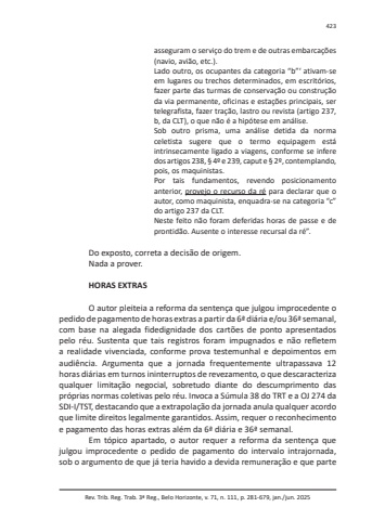 Rev. Trib. Reg. Trab. 3ª Reg., Belo Horizonte, v. 71, n. 111, p. 281-679, jan./jun. 2025423asseguram o serviço do trem e de outras embarcações (navio, avião, etc.).Lado outro, os ocupantes da categoria “b”‘ ativam-se em lugares ou trechos determinados, em escritórios, fazer parte das turmas de conservação ou construção da via permanente, oficinas e estações principais, ser telegrafista, fazer tração, lastro ou revista (artigo 237, b, da CLT), o que não é a hipótese em análise.Sob outro prisma, uma análise detida da norma celetista sugere que o termo equipagem está intrinsecamente ligado a viagens, conforme se infere dos artigos 238, § 4º e 239, caput e § 2º, contemplando, pois, os maquinistas.Por tais fundamentos, revendo posicionamento anterior, provejo o recurso da ré para declarar que o autor, como maquinista, enquadra-se na categoria “c” do artigo 237 da CLT.Neste feito não foram deferidas horas de passe e de prontidão. Ausente o interesse recursal da ré”.Do exposto, correta a decisão de origem.Nada a prover.HORAS EXTRASO autor pleiteia a reforma da sentença que julgou improcedente o pedido de pagamento de horas extras a partir da 6ª diária e/ou 36ª semanal, com base na alegada fidedignidade dos cartões de ponto apresentados pelo réu. Sustenta que tais registros foram impugnados e não refletem a realidade vivenciada, conforme prova testemunhal e depoimentos em audiência. Argumenta que a jornada frequentemente ultrapassava 12 horas diárias em turnos ininterruptos de revezamento, o que descaracteriza qualquer limitação negocial, sobretudo diante do descumprimento das próprias normas coletivas pelo réu. Invoca a Súmula 38 do TRT e a OJ 274 da SDI-I/TST, destacando que a extrapolação da jornada anula qualquer acordo que limite direitos legalmente garantidos. Assim, requer o reconhecimento e pagamento das horas extras além da 6ª diária e 36ª semanal.Em tópico apartado, o autor requer a reforma da sentença que julgou improcedente o pedido de pagamento do intervalo intrajornada, sob o argumento de que já teria havido a devida remuneração e que parte