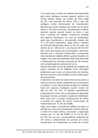 Rev. Trib. Reg. Trab. 3ª Reg., Belo Horizonte, v. 71, n. 111, p. 281-679, jan./jun. 2025425A ré suscita que a escala de trabalho desempenhada pelo autor configura jornada especial, prevista em norma coletiva válida, nos moldes do Tema 1046 do STF, com previsão do divisor 220 e que não configura turnos ininterruptos de revezamento. Ressalta que houve respeito aos limites de 10 horas diárias e 44 horas semanais, considerando o efetivo exercício apenas quando locado no trem, e que toda a jornada de trabalho encontra-se anotada nos registros eletrônicos. Em caso de condenação, pede seja considerada a remuneração simples das 7ª a 12ª horas trabalhadas. Alega ainda o respeito ao intervalo interjornada, dentro e fora da sede, nos termos do art. 239 da CLT e da cláusula 36ª do ACT, bem como das pausas para alimentação e descanso. Ressalta que o intervalo intrajornada é computado como tempo de trabalho efetivo quando tomadas em viagem, mas, pela eventualidade, pede seja observada a indenização do intervalo pactuado de 30 minutos, com compensação do adicional de turno.Inexiste discussão acerca da validade dos registros de ponto, anexados em ID. 385bc9c. Essas marcações evidenciam que o autor se ativava tanto em horários diurno e noturno, o que configura turnos ininterruptos de revezamento.A alternância do labor do autor entre turnos diurno e noturno é lesiva à saúde, impedindo que a reclamante se habitue a uma determinada jornada de trabalho, tanto em aspectos fisiológicos quanto sociais (OJ 360 da SDI-I do TST). O referido entendimento jurisprudencial condiz com os princípios da dignidade da pessoa humana, proteção à saúde do trabalhador, bem como com o escopo constitucional de limitar a jornada em regime de turnos ininterruptos de revezamento (art. 7º, XIV, da CR/88).Logo, como regra, a jornada de trabalho do autor, no período em turnos de revezamento, deveria observar o limite de 6 horas diárias, ressalvada a negociação coletiva (art. 7º, XIV, da CR/88 c/c OJ 274 da SDI-I do TST). Por sua vez, a jurisprudência tradicional do TST limita o elastecimento da jornada em turnos ininterruptos de revezamento ao limite de 8 horas