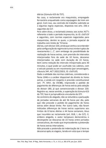Rev. Trib. Reg. Trab. 3ª Reg., Belo Horizonte, v. 71, n. 111, p. 281-679, jan./jun. 2025426diárias (Súmula 423 do TST).No caso, o reclamante era maquinista, empregado ferroviário enquadrado como equipagem de trem em geral. Com isso, seu contrato de trabalho submete-se a algumas regras especiais, dispostas nos arts. 236 e seguintes da CLT.Para além disso, a reclamada anexou aos autos ACT’s referente a todo o período imprescrito, às ID. c5d7c5f e seguintes, com normas especiais negociadas para maquinistas, dentre as quais, a jornada especial de trabalho com limite de “8 horasdiárias, com divisor 220, ainda que venha a se entender pela configuração do regime de turnos ininterruptos de revezamento (...)”, sem embargo da possibilidade de realização de horas extras, com previsão de intervalos interjornadas fora da sede de 10 horas, descanso interjornadas na sede com duração de 22 horas, bem como redução do intervalo intrajornada para 30 minutos, o qual pode ser usufruído nas cabines, com o veículo parado ou em movimento (por amostragem, cláusula 34ª, ACT 2022/2023, ID. c5d7c5f).Dada a validade das normas coletivas, considerando o Tema 1046 e o caráter disponível do direito às horas extras, e ainda em respeito à previsão constitucional (art. 7º, XXVI, da CR/88), improcede o pedido de pagamento de diferenças de horas extras pela adoção do divisor 180, já que convencionado o divisor 220. Registre-se, nesse sentido, a superação da Súmula 423 do TST, face à jurisprudência vinculante do STF.Ao contrário do alegado, não se vislumbra a pactuação de jornadas semanais de até 36 horas por dia, pelo que não procede o pedido de pagamento de horas extras além desse limite. Por outro lado, não foram indicadas diferenças de horas extras superiores aos limites de 8 horas diárias e 44 horas semanais, ônus que incumbia ao reclamante (art. 818, I, da CLT). E, embora alegado, o autor tampouco demonstrou o desrespeito ao descanso de 22 horas entre jornadas consecutivas, de modo que improcedente a pretensão de horas extras intervalares.Não procede a pretensão de indenização de 1 hora no descanso após as viagens, tendo em vista que o tempo