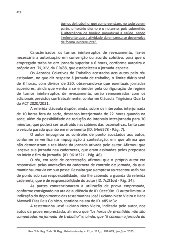 Rev. Trib. Reg. Trab. 3ª Reg., Belo Horizonte, v. 71, n. 111, p. 281-679, jan./jun. 2025428turnos de trabalho, que compreendam, no todo ou em parte, o horário diurno e o noturno, pois submetido à alternância de horário prejudicial à saúde, sendo irrelevante que a atividade da empresa se desenvolva de forma ininterrupta”.Caracterizados os turnos ininterruptos de revezamento, faz-se necessária a autorização em convenção ou acordo coletivo, para que o empregado trabalhe em jornada superior a 6 horas, conforme autoriza o próprio art. 7º, XIV, da CR/88, que estabeleceu a jornada especial.Os Acordos Coletivos de Trabalho acostados aos autos pelo réu estipulam, no que diz respeito à jornada de trabalho, o limite diário será de 8 horas, com divisor de 220, observando-se que eventuais jornadas superiores, ainda que venha a se entender pela configuração de regime de turnos ininterruptos de revezamento, serão remuneradas com os adicionais previstos contratualmente, conforme Cláusula Trigésima Quarta do ACT 2020/2021.A referida cláusula dispõe, ainda, sobre os intervalos interjornada de 10 horas fora da sede, descanso interjornada de 22 horas quando na sede, além da possibilidade de redução do intervalo intrajornada para 30 minutos, que poderá ser usufruído nas cabines das locomotivas, tanto com o veículo parado quanto em movimento (ID. 54e6578 - Pág. 7).O autor impugnou os controles de ponto acostados aos autos, conforme se verifica na impugnação à contestação, em que afirma que não demonstram a realidade da jornada ativada pelo autor. Afirmou que lançava sua jornada nas cadernetas, que eram assinadas pelos prepostos no início e fim da jornada. (ID. 961d321 - Pág. 46).O réu, em sede de contestação, afirmou que o próprio autor era responsável pelas anotações na caderneta de controle de jornada, da qual mantinha uma via em sua posse. Ressalta que a empresa apresentou as folhas de ponto sob sua responsabilidade, não lhe cabendo a guarda da referida caderneta, que é de responsabilidade do autor (ID. 7c2f1dd - Pág. 24).As partes convencionaram a utilização de prova emprestada, conforme consignado na ata de audiência de ID. 0ece90e. O autor limitou a indicação do depoimento das testemunhas José Luciano Neto Vieira e Hans Maxwell Dias Reis Colhido, contidos na ata de ID. a851d3c.A testemunha José Luciano Neto Vieira, indicada pelo autor, nos autos da prova emprestada, afirmou que “as horas de prontidão não são computadas na jornada de trabalho” e, ainda, que “é comum a jornada do