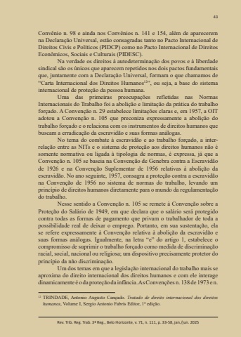 43Rev. Trib. Reg. Trab. 3ª Reg., Belo Horizonte, v. 71, n. 111, p. 33-58, jan./jun. 2025Convênio n. 98 e ainda nos Convênios n. 141 e 154, além de aparecerem na Declaração Universal, estão consagradas tanto no Pacto Internacional de Direitos Civis e Políticos (PIDCP) como no Pacto Internacional de Direitos Econômicos, Sociais e Culturais (PIDESC).Na verdade os direitos à autodeterminação dos povos e à liberdade sindical são os únicos que aparecem repetidos nos dois pactos fundamentais que, juntamente com a Declaração Universal, formam o que chamamos de “Carta Internacional dos Direitos Humanos12”, ou seja, a base do sistema internacional de proteção da pessoa humana.Uma das primeiras preocupações refletidas nas Normas Internacionais do Trabalho foi a abolição e limitação da prática do trabalho forçado. A Convenção n. 29 estabelece limitações claras e, em 1957, a OIT adotou a Convenção n. 105 que preconiza expressamente a abolição do trabalho forçado e o relaciona com os instrumentos de direitos humanos que buscam a erradicação da escravidão e suas formas análogas.No tema do combate à escravidão e ao trabalho forçado, a interrelação entre as NITs e o sistema de proteção aos direitos humanos não é somente normativa ou ligada à tipologia de normas, é expressa, já que a Convenção n. 105 se baseia na Convenção de Genebra contra a Escravidão de 1926 e na Convenção Suplementar de 1956 relativas à abolição da escravidão. No ano seguinte, 1957, consagra a proteção contra a escravidão na Convenção de 1956 no sistema de normas do trabalho, levando um princípio de direitos humanos diretamente para o mundo da regulamentação do trabalho.Nesse sentido a Convenção n. 105 se remete à Convenção sobre a Proteção do Salário de 1949, em que declara que o salário será protegido contra todas as formas de pagamento que privam o trabalhador de toda a possibilidade real de deixar o emprego. Portanto, em sua sustentação, ela se refere expressamente à Convenção relativa à abolição da escravidão e suas formas análogas. Igualmente, na letra “e” do artigo 1, estabelece o compromisso de suprimir o trabalho forçado como medida de discriminação racial, social, nacional ou religiosa; um dispositivo precisamente protetor do princípio da não discriminação.Um dos temas em que a legislação internacional do trabalho mais se aproxima do direito internacional dos direitos humanos e com ele interage dinamicamente é o da proteção da infância. As Convenções n. 138 de 1973 e n. 12 TRINDADE, Antonio Augusto Cançado. Tratado de direito internacional dos direitos humanos, Volume I, Sergio Antonio Fabris Editor, 1ª edição.