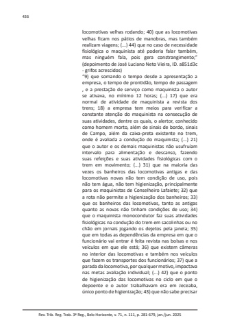 Rev. Trib. Reg. Trab. 3ª Reg., Belo Horizonte, v. 71, n. 111, p. 281-679, jan./jun. 2025436locomotivas velhas rodando; 40) que as locomotivas velhas ficam nos pátios de manobras, mas também realizam viagens; (...) 44) que no caso de necessidade fisiológica o maquinista até poderia falar também, mas ninguém fala, pois gera constrangimento;” (depoimento de José Luciano Neto Vieira, ID. a851d3c - grifos acrescidos)“9) que somando o tempo desde a apresentação a empresa, o tempo de prontidão, tempo de passagem , e a prestação de serviço como maquinista o autor se ativava, no mínimo 12 horas; (...) 17) que era normal de atividade de maquinista a revista dos trens; 18) a empresa tem meios para verificar a constante atenção do maquinista na consecução de suas atividades, dentre os quais, o alertor, conhecido como homem morto, além de sinais de bordo, sinais de Campo, além da caixa-preta existente no trem, onde é avaliada a condução do maquinista; (...) 21) que o autor e os demais maquinistas não usufruíam intervalo para alimentação e descanso, fazendo suas refeições e suas atividades fisiológicas com o trem em movimento; (...) 31) que na maioria das vezes os banheiros das locomotivas antigas e das locomotivas novas não tem condição de uso, pois não tem água, não tem higienização, principalmente para os maquinistas de Conselheiro Lafaiete; 32) que a rota não permite a higienização dos banheiros; 33) que os banheiros das locomotivas, tanto as antigas quanto as novas não tinham condições de uso; 34) que o maquinista monocondutor faz suas atividades fisiológicas na condução do trem em sacolinhas ou no chão em jornais jogando os dejetos pela janela; 35) que em todas as dependências da empresa em que o funcionário vai entrar é feita revista nas bolsas e nos veículos em que ele está; 36) que existem câmeras no interior das locomotivas e também nos veículos que fazem os transportes dos funcionários; 37) que a parada da locomotiva, por qualquer motivo, impactava nas metas avaliação individual; (...) 42) que o ponto de higienização das locomotivas no ciclo em que o depoente e o autor trabalhavam era em Jeceaba, único ponto de higienização; 43) que não sabe precisar