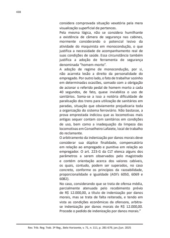 Rev. Trib. Reg. Trab. 3ª Reg., Belo Horizonte, v. 71, n. 111, p. 281-679, jan./jun. 2025438considera comprovada situação vexatória pela mera visualização superficial de pertences.Pela mesma lógica, não se considera humilhante a existência de câmera de segurança nas cabines, mormente considerando o potencial lesivo da atividade do maquinista em monocondução, o que justifica a necessidade de acompanhamento real de suas condições de saúde. Essa circunstância também justifica a adoção de ferramenta de segurança denominada “homem-morto”.A adoção de regime de monocondução, por si, não acarreta lesão a direito da personalidade do empregado. Por outro lado, o fato de trabalhar sozinho em determinadas ocasiões, somado com a obrigação de acionar o referido pedal de homem morto a cada 40 segundos, de fato, quase inviabiliza o uso de sanitários. Soma-se a isso a notória dificuldade de paralisação dos trens para utilização de sanitários em paradas, situação que obviamente prejudicaria toda a organização do sistema ferroviário. Não bastasse, a prova emprestada indiciou que as locomotivas mais antigas sequer contam com sanitários em condições de uso, bem como a inadequação da limpeza das locomotivas em Conselheiro Lafaiete, local de trabalho do reclamante.O arbitramento da indenização por danos morais deve considerar sua dúplice finalidade, compensatória em relação ao empregado e punitiva em relação ao empregador. O art. 223-G da CLT elenca alguns dos parâmetros a serem observados pelo magistrado e contém orientação acerca dos valores cabíveis, os quais, contudo, podem ser superados, no caso concreto, conforme os princípios da razoabilidade, proporcionalidade e igualdade (ADI’s 6050, 6069 e 6082).No caso, considerando que se trata de ofensa média, parcialmente atenuada pelo recebimento prévio de R$ 12.000,00, a título de indenização por danos morais, mas se trata de falta reiterada, e tendo em vista as condições econômicas da ofensora, arbitrase indenização por danos morais de R$ 12.000,00. Procede o pedido de indenização por danos morais.”