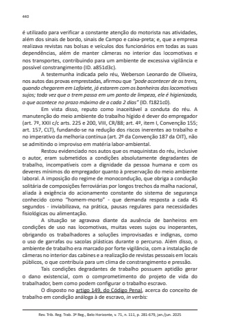 Rev. Trib. Reg. Trab. 3ª Reg., Belo Horizonte, v. 71, n. 111, p. 281-679, jan./jun. 2025440é utilizado para verificar a constante atenção do motorista nas atividades, além dos sinais de bordo, sinais de Campo e caixa-preta; e, que a empresa realizava revistas nas bolsas e veículos dos funcionários em todas as suas dependências, além de manter câmeras no interior das locomotivas e nos transportes, contribuindo para um ambiente de excessiva vigilância e possível constrangimento (ID. a851d3c).A testemunha indicada pelo réu, Weberson Leonardo de Oliveira, nos autos das provas emprestadas, afirmou que “pode acontecer de os trens, quando chegarem em Lafaiete, já estarem com os banheiros das locomotivas sujos; toda vez que o trem passa em um ponto de limpeza, ele é higienizado, o que acontece no prazo máximo de a cada 2 dias” (ID. f1821c0).Em vista disso, reputo como inaceitável a conduta do réu. A manutenção do meio ambiente do trabalho hígido é dever do empregador (art. 7º, XXII c/c arts. 225 e 200, VIII, CR/88; art. 4º, item I, Convenção 155; art. 157, CLT), fundando-se na redução dos riscos inerentes ao trabalho e no imperativo da melhoria contínua (art. 2º da Convenção 187 da OIT), não se admitindo o improviso em matéria labor-ambiental.Restou evidenciado nos autos que os maquinistas do réu, inclusive o autor, eram submetidos a condições absolutamente degradantes de trabalho, incompatíveis com a dignidade da pessoa humana e com os deveres mínimos do empregador quanto à preservação do meio ambiente laboral. A imposição do regime de monocondução, que obriga a condução solitária de composições ferroviárias por longos trechos da malha nacional, aliada à exigência do acionamento constante do sistema de segurança conhecido como “homem-morto” - que demanda resposta a cada 45 segundos - inviabilizava, na prática, pausas regulares para necessidades fisiológicas ou alimentação.A situação se agravava diante da ausência de banheiros em condições de uso nas locomotivas, muitas vezes sujos ou inoperantes, obrigando os trabalhadores a soluções improvisadas e indignas, como o uso de garrafas ou sacolas plásticas durante o percurso. Além disso, o ambiente de trabalho era marcado por forte vigilância, com a instalação de câmeras no interior das cabines e a realização de revistas pessoais em locais públicos, o que contribuía para um clima de constrangimento e pressão.Tais condições degradantes de trabalho possuem aptidão gerar o dano existencial, com o comprometimento do projeto de vida do trabalhador, bem como podem configurar o trabalho escravo.O disposto no artigo 149, do Código Penal, acerca do conceito de trabalho em condição análoga à de escravo, in verbis: