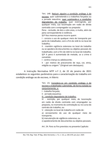 Rev. Trib. Reg. Trab. 3ª Reg., Belo Horizonte, v. 71, n. 111, p. 281-679, jan./jun. 2025441“Art. 149. Reduzir alguém a condição análoga à de escravo, quer submetendo-o a trabalhos forçados ou a jornada exaustiva, quer sujeitando-o a condições degradantes de trabalho, quer restringindo, por qualquer meio, sua locomoção em razão de dívida contraída com o empregador ou preposto:Pena - reclusão, de dois a oito anos, e multa, além da pena correspondente à violência.§1º Nas mesmas penas incorre quem:I - cerceia o uso de qualquer meio de transporte por parte do trabalhador, com o fim de retê-lo no local de trabalho;II - mantém vigilância ostensiva no local de trabalho ou se apodera de documentos ou objetos pessoais do trabalhador, com o fim de retê-lo no local de trabalho.§2º A pena é aumentada de metade, se o crime é cometido:I - contra criança ou adolescente;II - por motivo de preconceito de raça, cor, etnia, religião ou origem.” (Original sem destaques).A Instrução Normativa MTP n.º 2, de 22 de janeiro de 2021 estabelece os seguintes parâmetros para a caracterização do trabalho em condição análogo ao de escravo, in litteris:“Art. 23. Considera-se em condição análoga à de escravo o trabalhador submetido, de forma isolada ou conjuntamente, a:I - trabalho forçado;II - jornada exaustiva;III - condição degradante de trabalho;IV - restrição, por qualquer meio, de locomoção em razão de dívida contraída com empregador ou preposto, no momento da contratação ou no curso do contrato de trabalho; ouV - retenção no local de trabalho em razão de:a) cerceamento do uso de qualquer meio de transporte;b) manutenção de vigilância ostensiva; ouc) apoderamento de documentos ou objetos pessoais.Art. 24. Para os fins previstos no presente Capítulo: