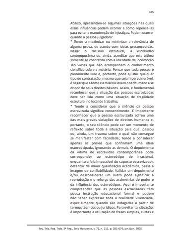 Rev. Trib. Reg. Trab. 3ª Reg., Belo Horizonte, v. 71, n. 111, p. 281-679, jan./jun. 2025445Abaixo, apresentam-se algumas situações nas quais essas influências podem ocorrer e como repensá-las para evitar a manutenção de injustiças. Podem ocorrer quando a pessoa julgadora:* Tende a maximizar ou minimizar a relevância de alguma prova, de acordo com ideias preconcebidas. Negar o racismo estrutural, a escravidão contemporânea ou, ainda, acreditar que esta última somente se concretiza com a liberdade de locomoção são vieses que não acompanham o conhecimento científico sobre a matéria. Pensar que toda pessoa é plenamente livre e, portanto, pode ajustar qualquer tipo de contratação, mesmo que seja hipervulnerável, é negar que a fome e a miséria levam o ser humano a se dispor de seus direitos básicos. Assim, é fundamental reconhecer que a situação das pessoas escravizadas deve ser lida como uma situação de fragilidade estrutural no local de trabalho;* Tende a considerar que o silêncio da pessoa escravizada significa consentimento. É importante reconhecer que a pessoa escravizada sofreu uma das mais graves violações de direitos humanos e, portanto, o seu silêncio pode ser um momento de reflexão sobre toda a situação pela qual passou ou, ainda, um trauma sobre o qual não consegue se manifestar com facilidade; Tende a considerar apenas as provas que confirmam uma ideia estereotipada, ignorando as demais. O depoimento da vítima de escravidão contemporânea pode corresponder ao estereótipo de irracional, enquanto a fala impassível do suposto escravizador, detentor de maior qualificação acadêmica, passa a imagem de confiabilidade. Validar um depoimento e/ou desconsiderar um outro pode significar a reprodução e o reforço das assimetrias de poder e da influência dos estereótipos. Aqui é importante compreender que as pessoas escravizadas têm pouca instrução educacional formal e podem não saber expressar toda a realidade vivenciada, especialmente quando são indagadas a partir de termos técnicos ou jurídicos. Para evitar tal situação, é importante a utilização de frases simples, curtas e